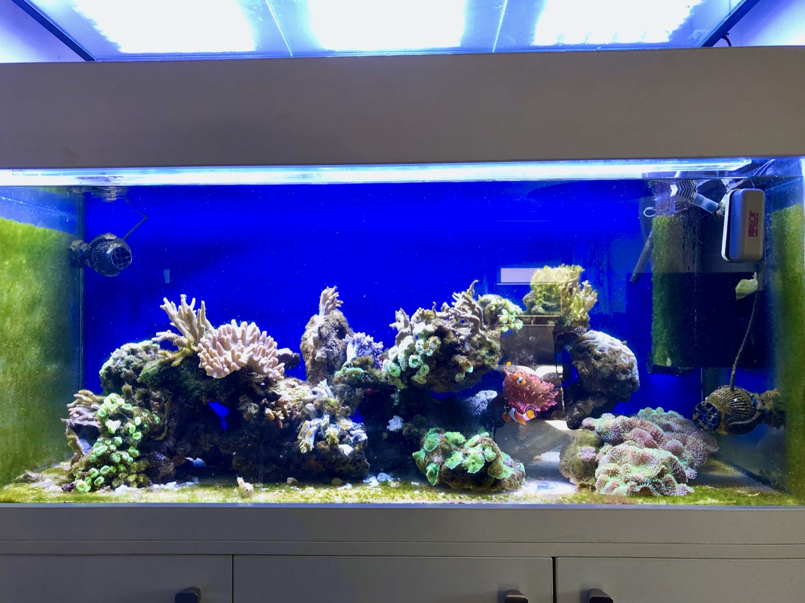 - Besatz: 2 Clownfische, 3 Riffbarsche, 5 Einsiedler, die eine oder andere Schnecke, die den Eingriff überlebt hat.