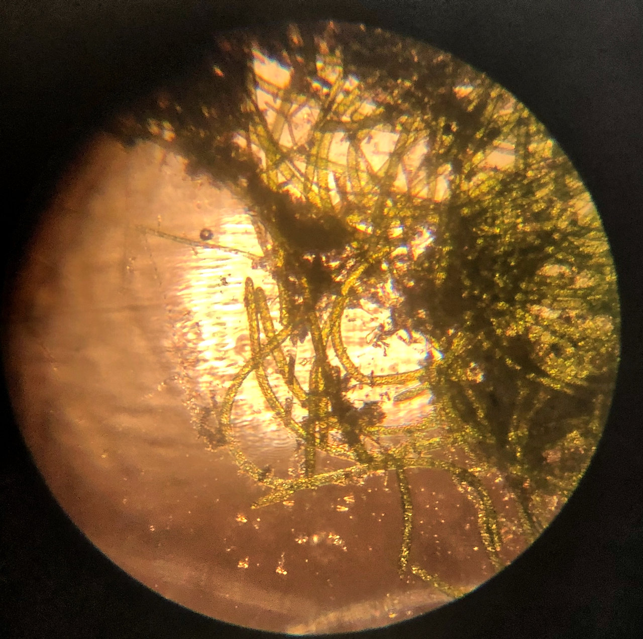 Ich habe momentan nur das Handy zum Fotografieren und mein Mikroskop ist gleich alt wie ich.... Aber vielleicht erkennt ihr da was. Ich leihe mir sonst eine Kamera aus für bessere Aufnahmen. Es erinnert mich etwas an die Moosbälle, die es für das Süßwasser gibt.