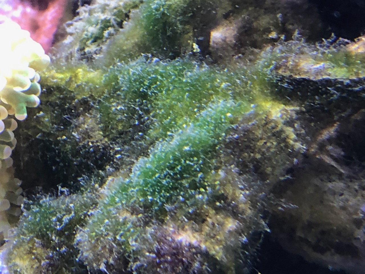 Ich brauche doch noch einmal eure Hilfe: Fadenalgen sind nach der manuellen Entfernung kaum mehr nachgewachsen, jedoch etabliert sich am LG und tw. auf den LPS eine sehr drahtige, buschige Algenart, die mir unbekannt ist. Trotz niedriger Nährstoffwerte ist diese schön grün und fühlt sich irgendwie dratig/pelzig an. Kennt ihr diese Alge? Und soll ich auf meiner Dosierung etwas ändern? Derzeit nur Sangokai Basis, seit gestern mit 2,4ml für mein 240l Becken, die Woche vorher noch 2ml/240l (lt. Startdosierplan) sowie HED3 2x die Woche lt. Plan.