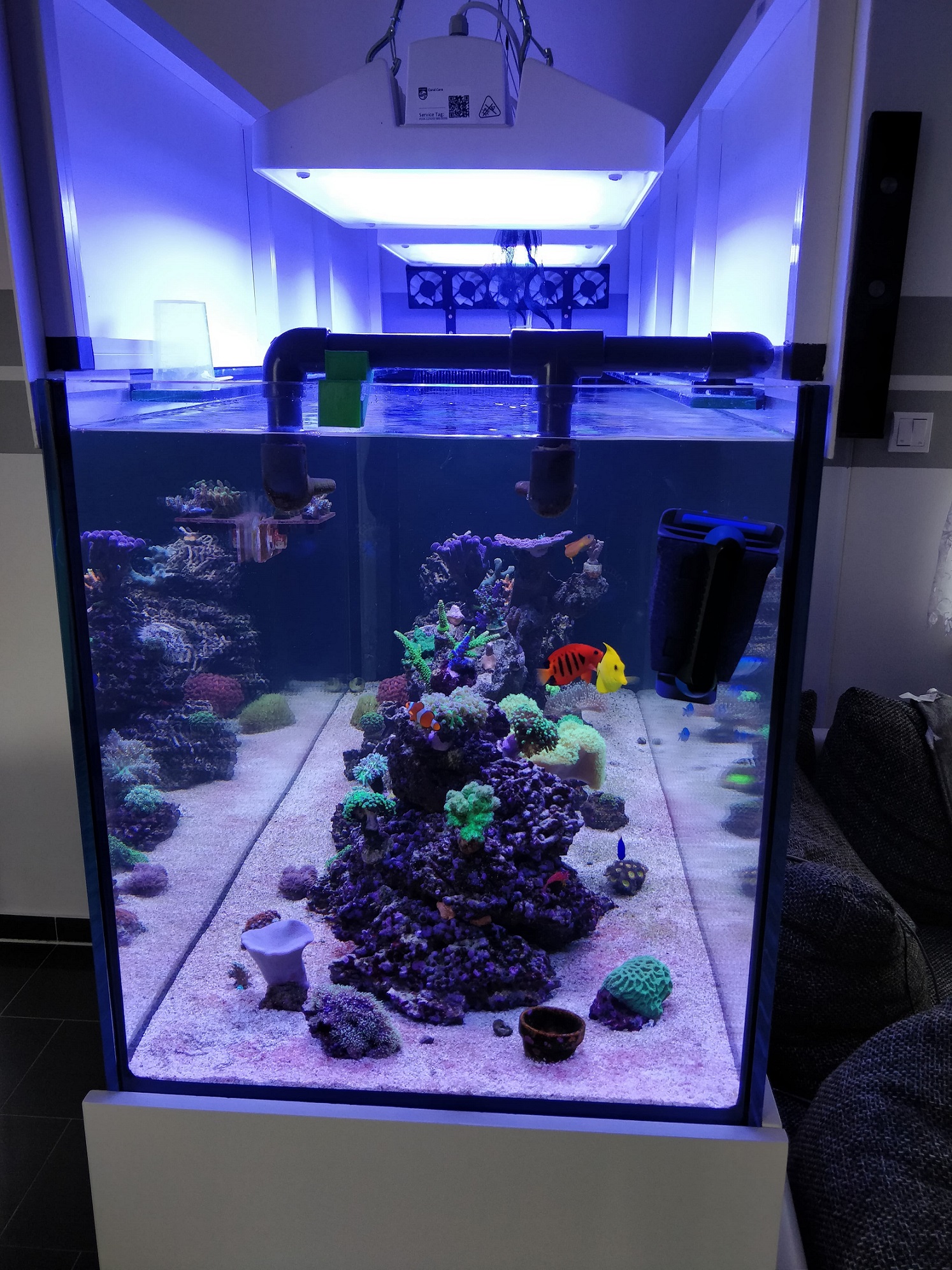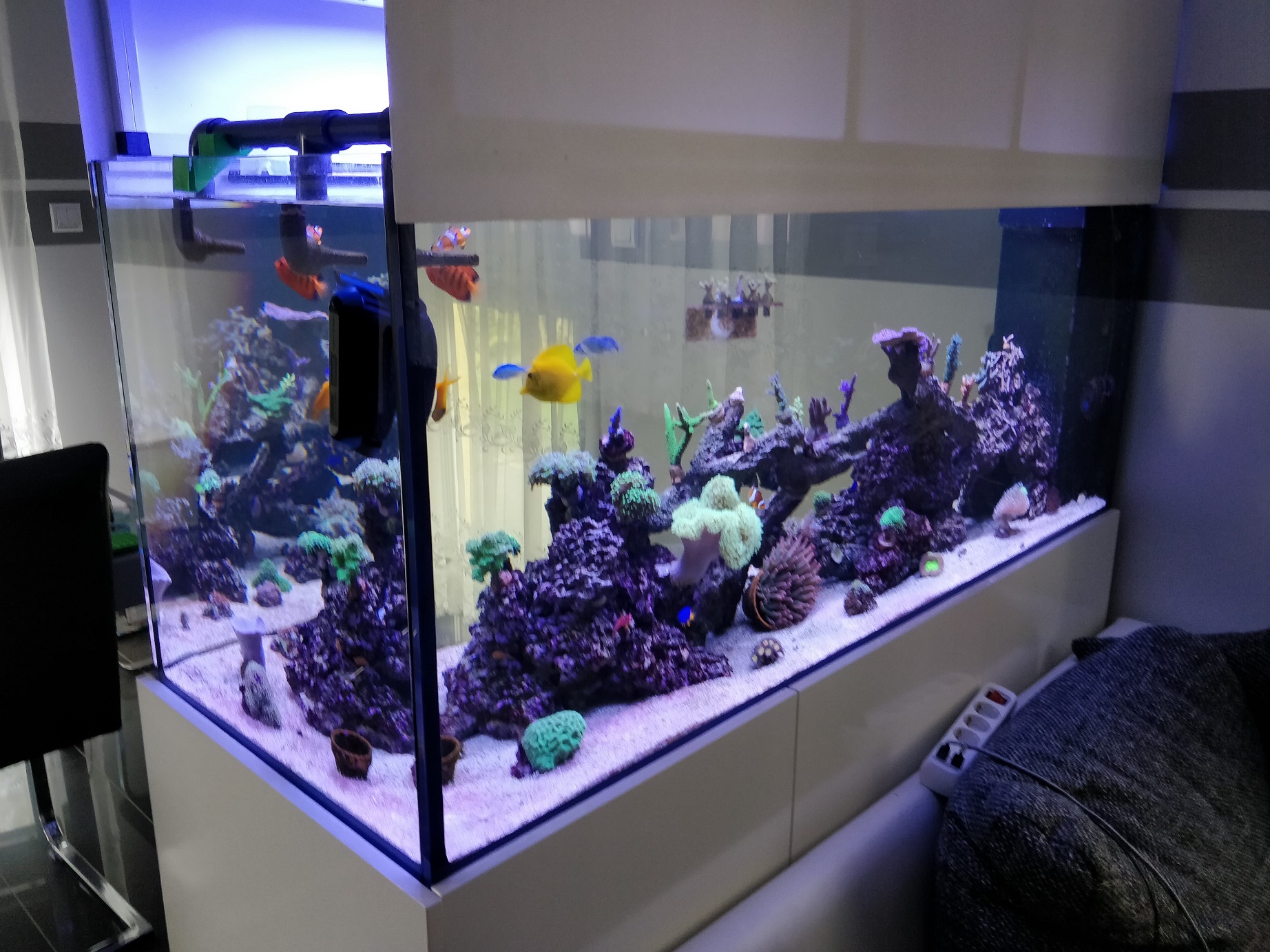 Guten Abend, Ich möchte euch hier mein Becken Vorstellen und Anamnese bogen hochladen, Das Becken steht so seit 12/2019, vorher hatte ich ein 150 Liter Meerwasserbecken und habe mich dann vergrößert, aus dem kleinen Becken habe ich den Korallenbesatz und Fischbesatz mit rüber genommen und das Lebendgestein ist ins neue TB gewandert, ein Hand voll Sand kam auch mit rüber zum animpfen.