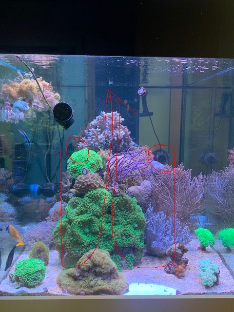 3. Der Sandboden ( 1-2mm Körnung) ist doch relativ zugestellt mit Korallen, was auch wieder Mulm-Ecken hervorrufen könnte.
