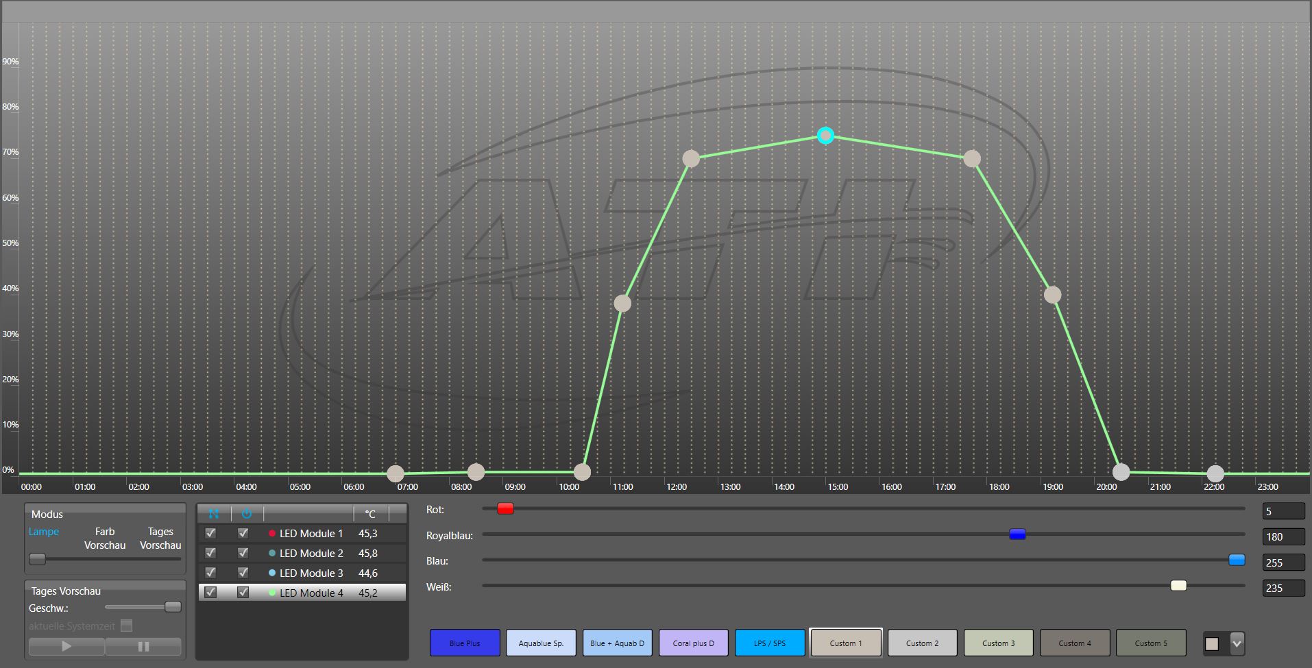 Hallo Daniel, die spektrale Zusammensetzung sollte geändert werden. Der Rot Anteil mit 50 ist viel zu hoch. Stelle die Lampe folgendermaßen ein: