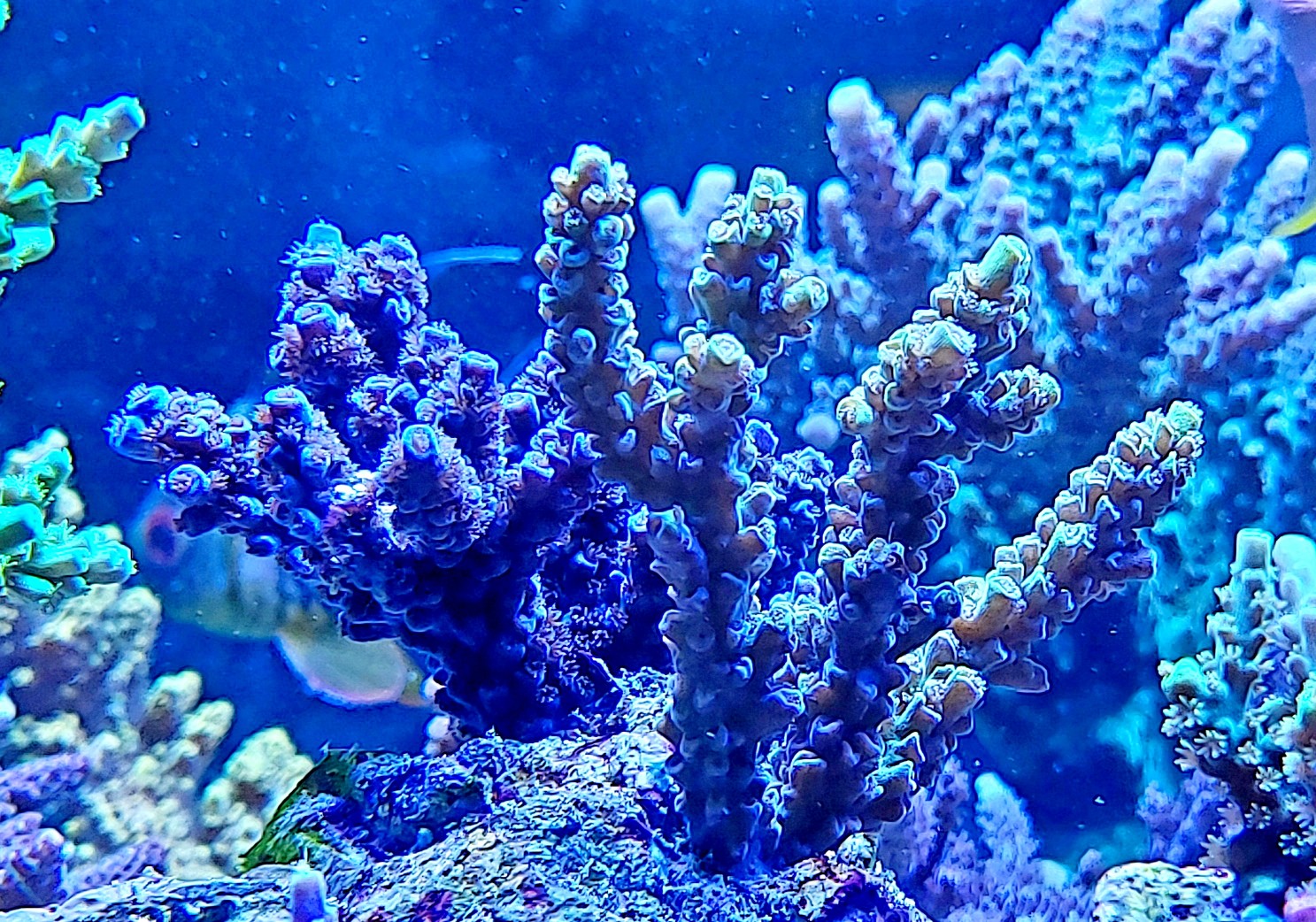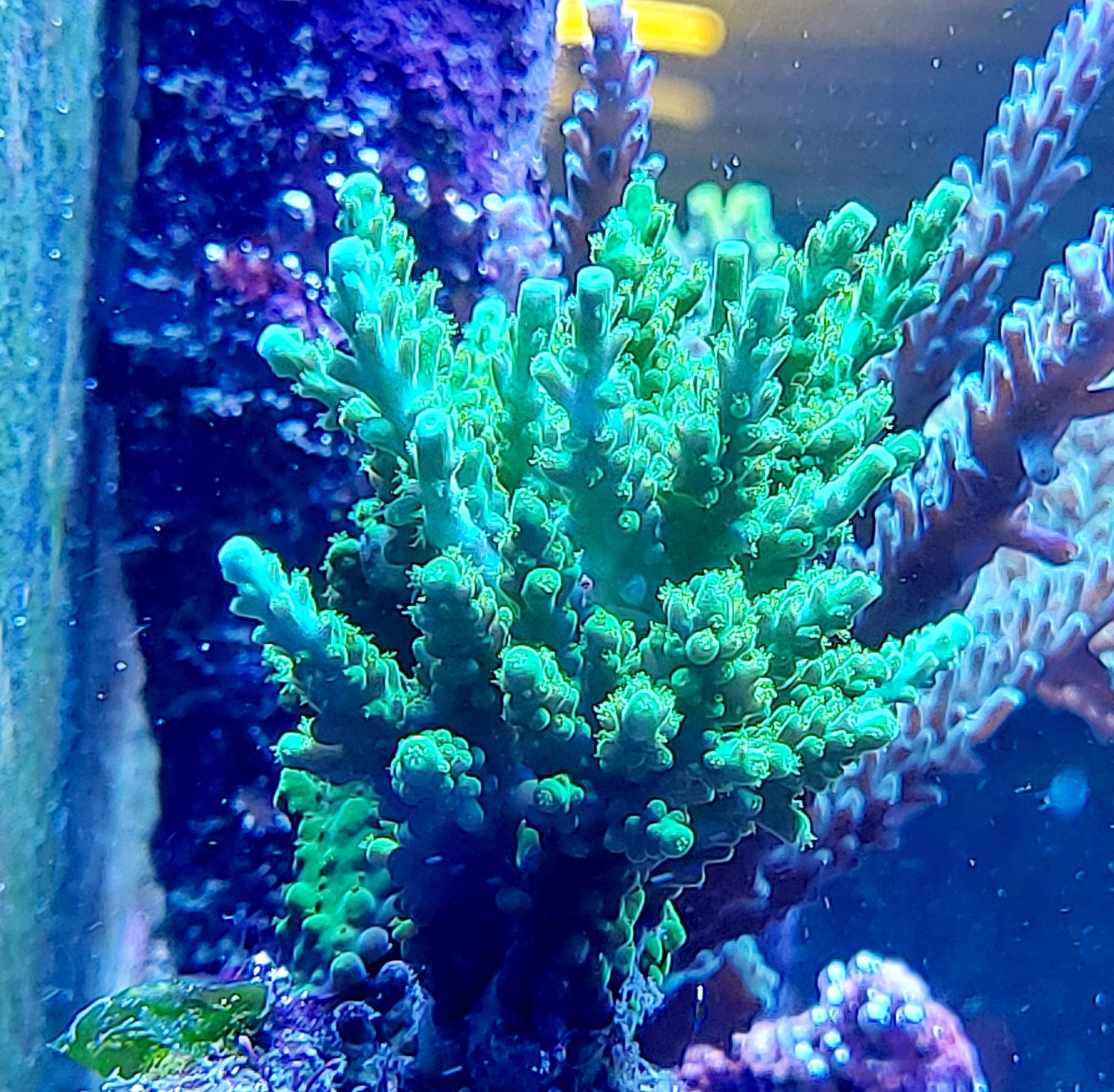 Ich vermute, dass die Lichtstärke bzw. Zusammensetzung das bewirken könnte. Beleuchtet wird mit Orphek Atlantik V4 Compact. Die Lampen sind 1 1/2 Jahre alt und werden 6 Stunden mit 80% Weiß/Blau und 50% Violett gefahren. Rot ist nur bei 20%. Hauptbeleuchtung ist 6 Stunden.