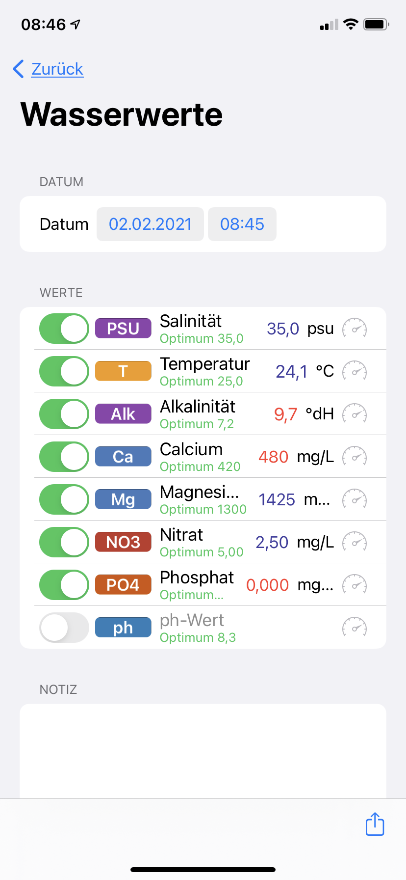 Salinität ist zu hoch. Ich habe bereits mit 8L Osmose angepasst.