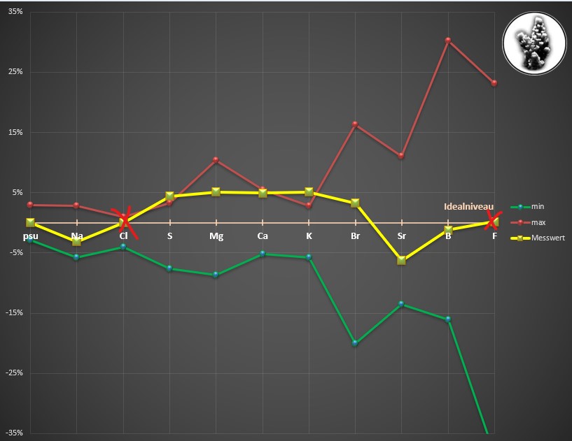 Bitte messe selber die Salinität, KH und den Nitrat Gehalt. Welches Meersalz verwendest Du? Die Werte der Hauptelemente (Schwefel, Magnesium, Calcium, Kalium und Brom) sind alle ein wenig erhöht.