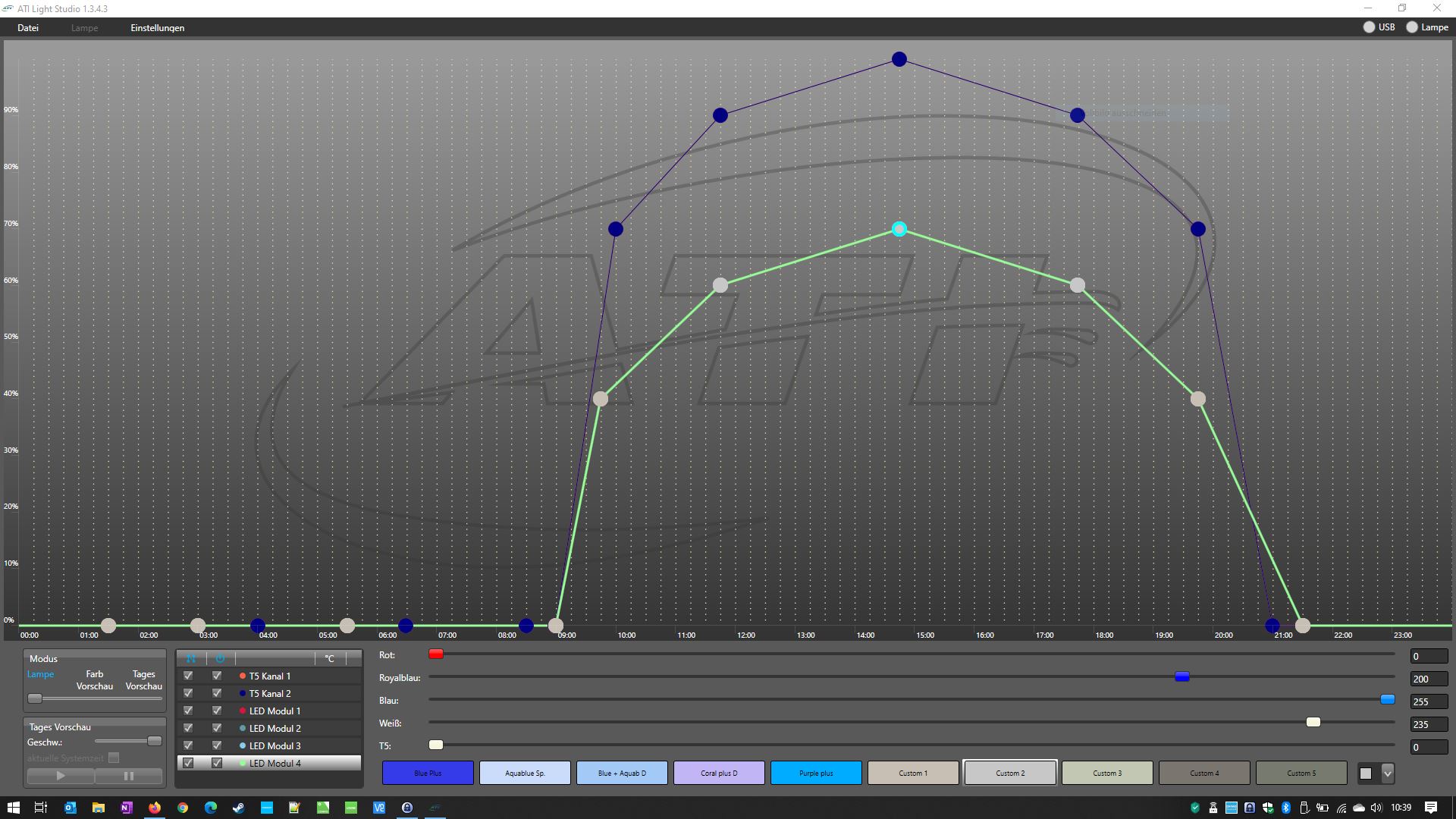 hier noch das Beleuchtungsprogramm. Die lila Kurve sind die T5 Röhren, alle LEDs sind identisch eingestellt.