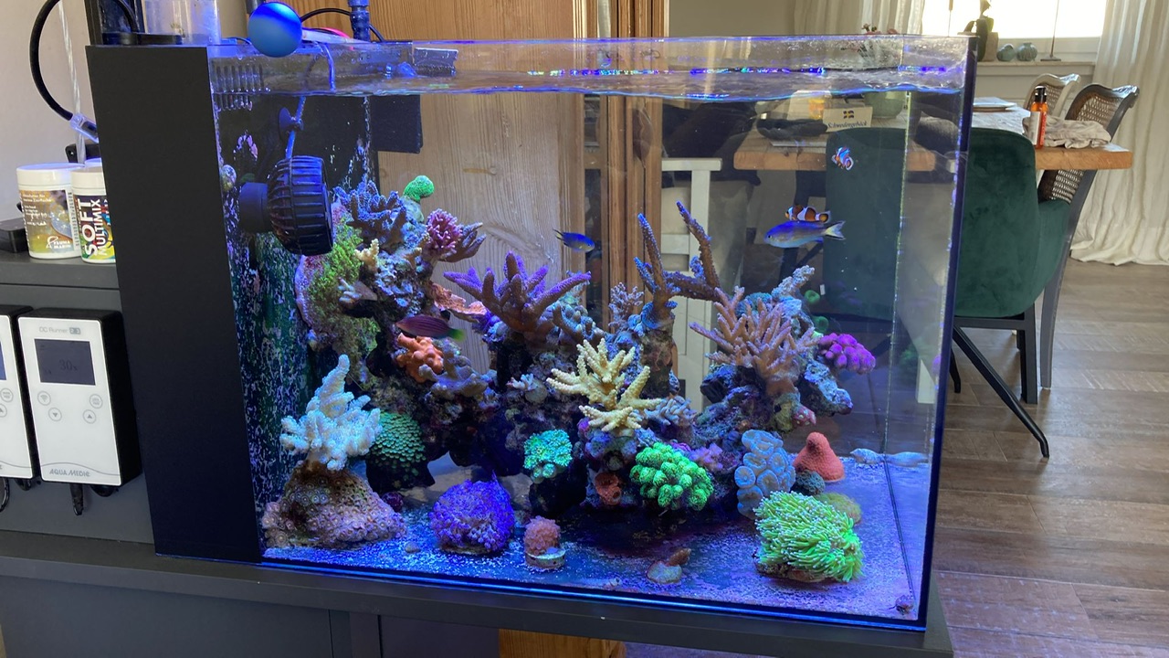 Außerdem habe ich meine beiden AM 3.1 Pumpen durch EINE AM 7.1 ersetzt! Jetzt ist die Strömung viel besser und die Korallen scheinen es zu mögen! Hab auch weniger Mulm auf dem Boden und nur noch eine kleine Ecke wo es sich sammelt. Da kann ich es leicht absaugen.