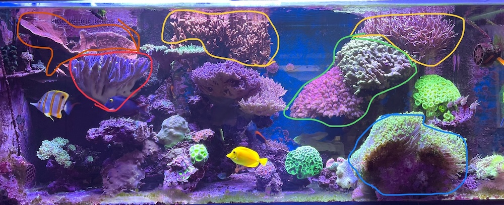 - blau eingekringelt: Goniopora (oder Alveopora) - die wuchert ziemlich und vernesselt vieles im Umfeld. Diese würde ich komplett rausnehmen und durch eine etwas weniger schnell wachsende Gonio ersetzen. Prinzipiell gefallen mir die langen, in der Strömung wabernden Tentakel.