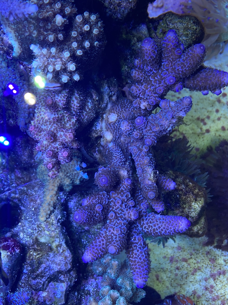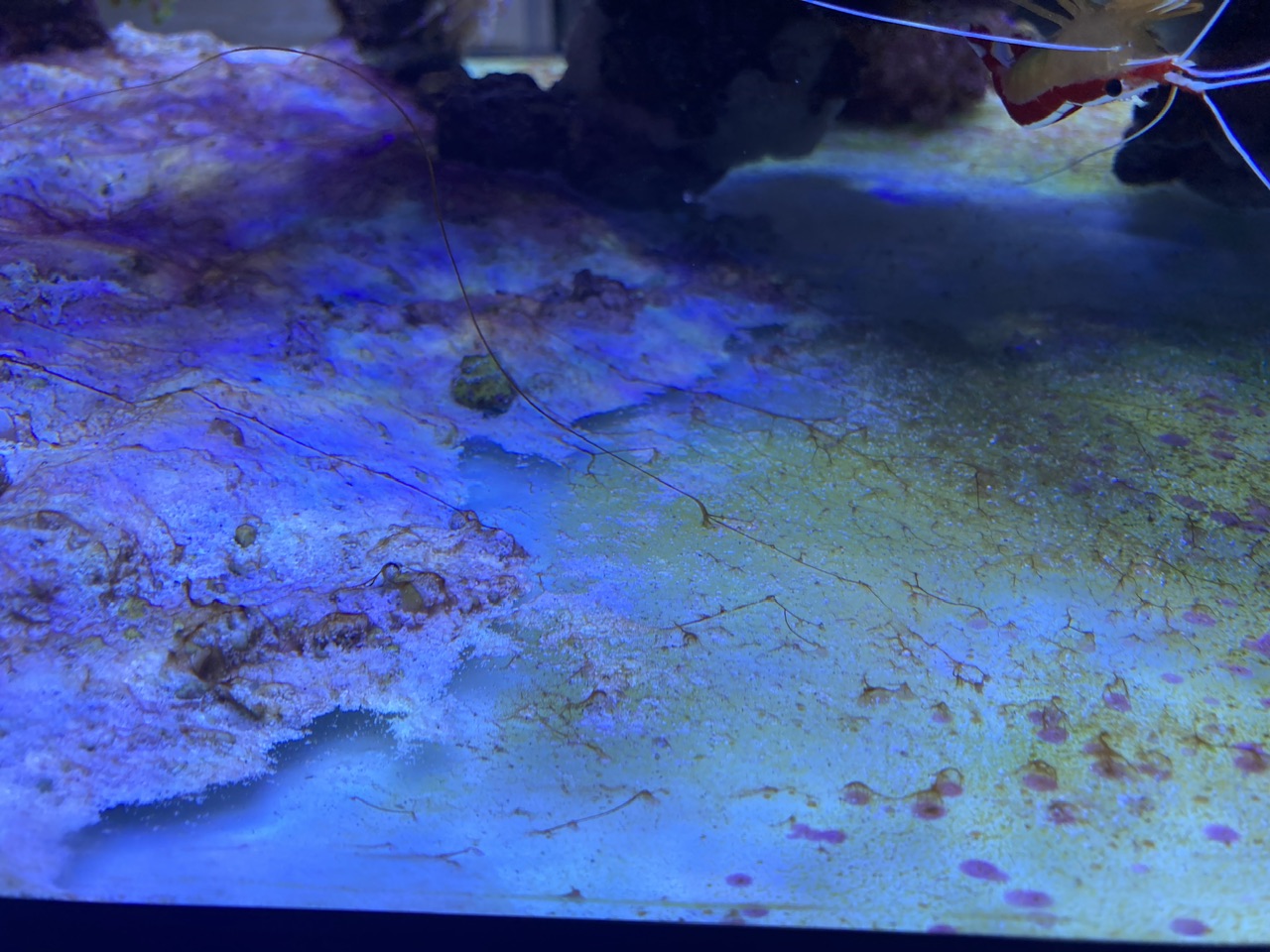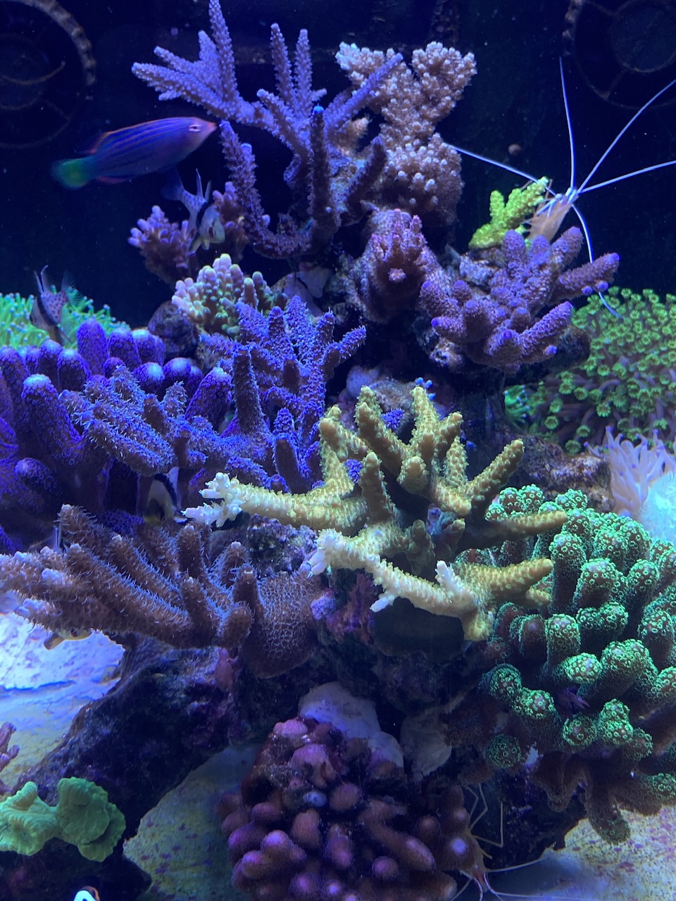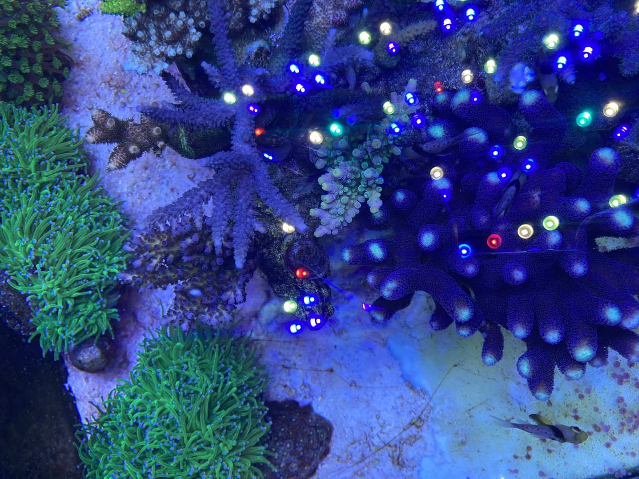 Gerade jetzt ist eh wieder Cyanozeit, möglicherweise auch einhergehend mit Veränderungen in der Wassertemperatur, Tageslänge etc. Ich würde da nicht immer direkt etwas versuchen zu machen. Die pinke Stylo schaut auch sehr von der oberen Koralle irgendwie bedrängt oder abgeschattet zu sein, hier auf jeden Fall mal schauen, ob Du vielleicht mit der Strömung etwas verbessern kannst. Aber sonst würde ich das eher erst mal laufen lassen. Das mit der Milka und dem kompletten Einziehen habe ich bei mir auch ab und zu mal, wenn die wurdemannis da drin rum springen. Und bei Dir sitzt so ganz unschuldig eine Putzergaarnele daneben... Könntest Du bitte noch ein Foto mit den Dinos auf einer Gesamtaufnahme zeigen, damit man sieht, wo die genau sind und welche Koralle die ggf. ausgestoßen hat bzw. ob das eine Plage ist oder nicht? Das wäre hilfreich.