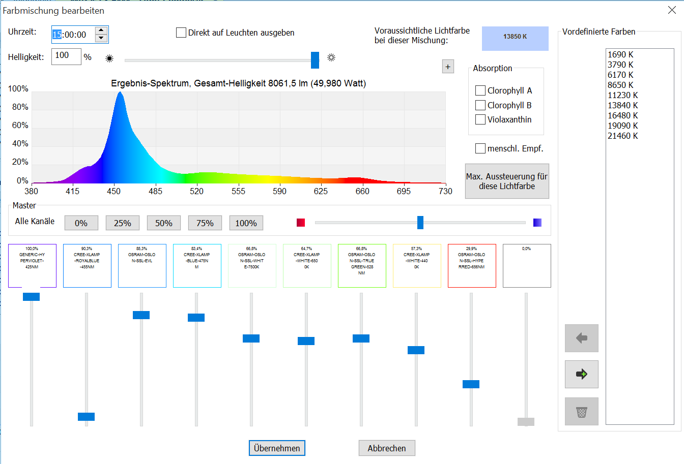 Ganz oben habe ich die Lichtquellen. Die kann ich gar nicht editieren. Die scheinen so vorgeben zu sein: Den kann ich individuell einstellen. Da kann ich eine Uhrzeit definieren und einstellen welcher Kanal wie stark leuchten soll und dann ins Summe auch noch wie stark.