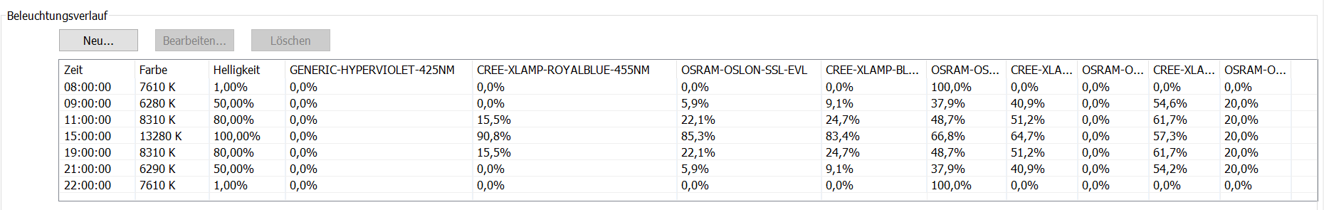 Die Lichtkurve ist mal auf 11 Stunden reduziert. Royalblau ist nun 20% weniger als blau.
