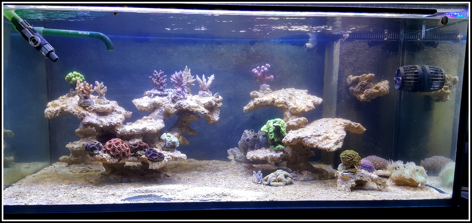 So langsam aber sicher solltest Du ein paar Produzenten einplanen, die Korallen und Mikroben etc. ziehen Nährstoffe, d.h. Du kannst mit dem Fischbesatz so langsam starten.