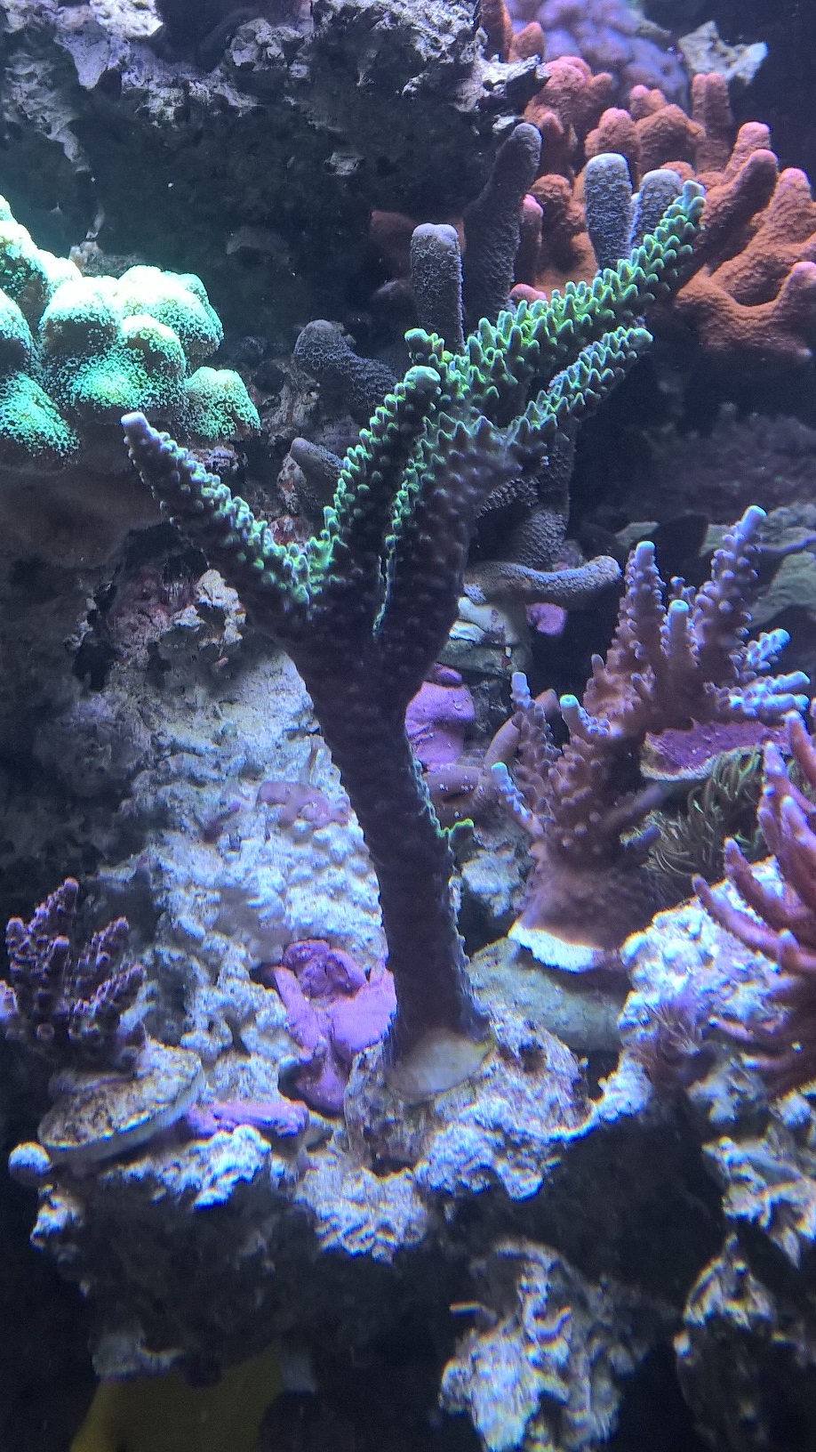 Also, auch wenn ich im allgemeinen mit dem Becken recht gut zufrieden bin, habe ich mit den Acros momentan teilweise noch Probleme. Eine tricolor steht recht gut, wächst langsam und zeigt auch ihre Polypen. Die Enzmann ist allerdings immer weiter eingedunkelt und man sieht kaum Polypen. Heute habe ich an der Fussscheibe auch gesehen, dass sie von unten weiß wird. Vor ein paar Tagen habe ich mal den Standort gewechselt aber auch das brachte leider keine positive Auswirkungen auf das Polypenbild.