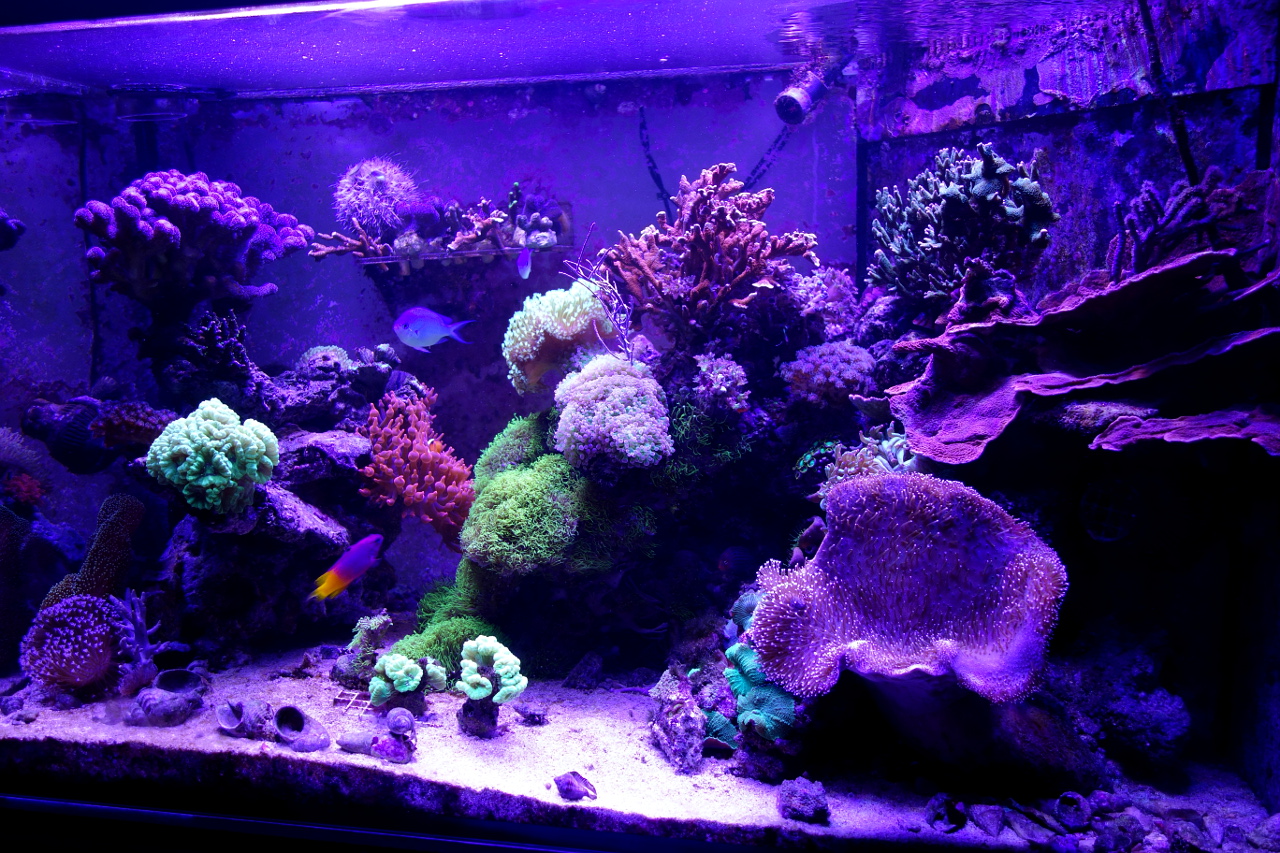 • Die Korallen stehen alles in allem gut da. Allerdings habe ich ein massives Aufkommen von kleinen Seesternen jeglicher Form :>, die sich scheinbar ganz gern an die SPS setzen, sodass von unter her Gefahr droht. Ich versuche derzeit den Bestand zu minimieren, in dem ich mit dem Kecher, zu gewissen Zeiten die Scheiben abgrase. Wenn sich die Situation nicht bessert, werde ich wohl zur Garnelenattacke blasen.