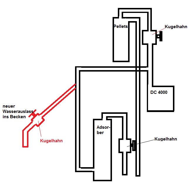 Beide Wirbelfilter werden mit ein und der selben Pumpe betrieben, einer Jebao DC 4000 welche auf Stufe 3 (von 10) läuft, dabei kann ich aber den Durchfluss in den Wirbelfiltern noch durch Kugelhähne regulieren. Auch könnte ich dieses "Rohrsystem" noch so ändern, dass ich eine Abzweigung einbauen die dann als Rückförderung ins Becken fungiert und die Jebao auf volle Leistung stellen. Das könnte eventuell funktionieren um den Durchfluss im Technikabteil zu erhöhen. Um das mal zu verdeutlichen habe ich mal eine Zeichnung gemacht. Schwarz = Ist-Zustand, Rot = Vorstellung.