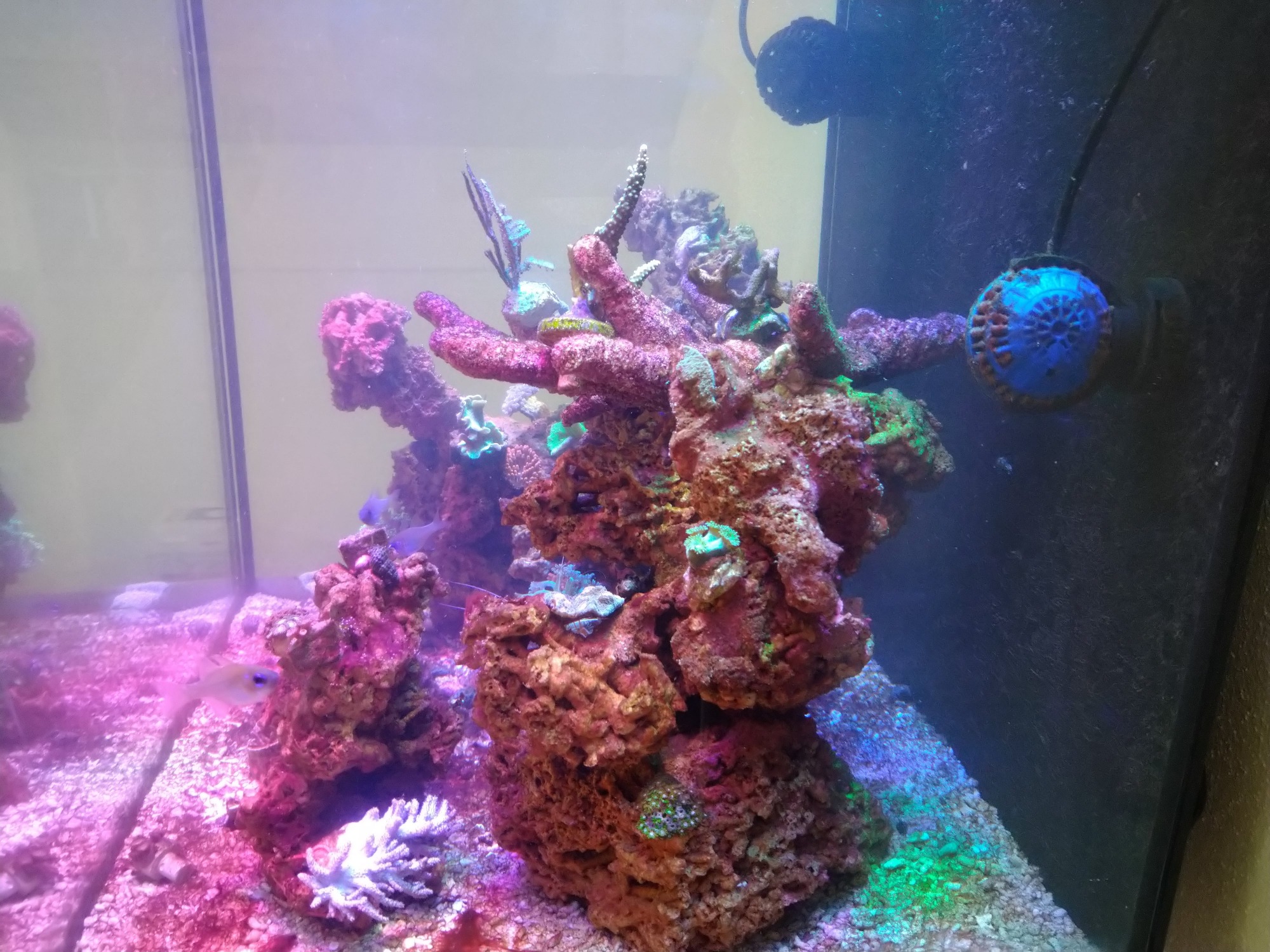 * gestartet mit Totgestein, Riffaufbau selbst zusammengestellt. (habe dieses Gestein für 4 Tage in Wasser aus dem Mischbettfilter gelegt und PO4 gemessen, nichts drinnen)