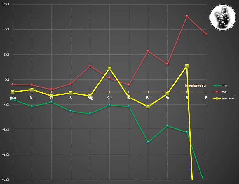 bis auf Fluor sehen die Ergebnisse bzgl. den Hauptelementen gut aus. Fluor auf jeden Fall einzeln von 0,5 auf 1,26mg/l anheben. Calcium und Bor sind erhöht. Die tägliche Calcium Dosierung ein wenig reduzieren. Die anderen Hauptelemente sind in Relation zu deiner Salinität von 33,9psu sehr nah am Idealniveau. Bzgl Magnesium besteht kein Handlungsbedarf.