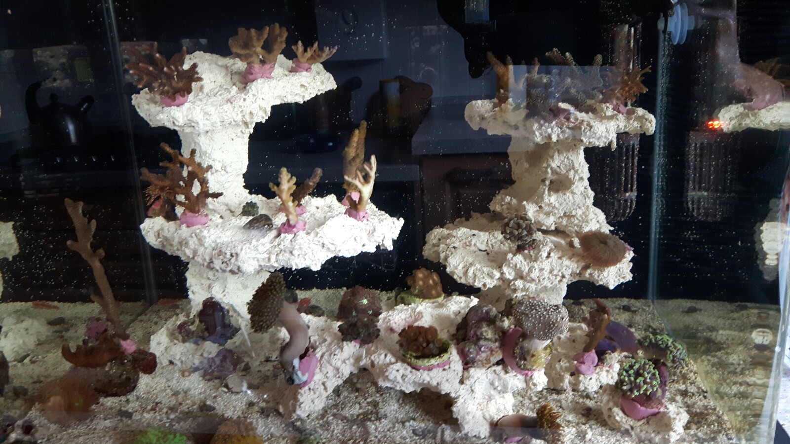 ein bild des beckens hänge ich an. Leider ist die beleuchtung noch aus. Eine Acro hat vor 4 tagen an einer stelle des gewebe abgeschmissen und eine Sacro zickt seit 2 Tagen.
