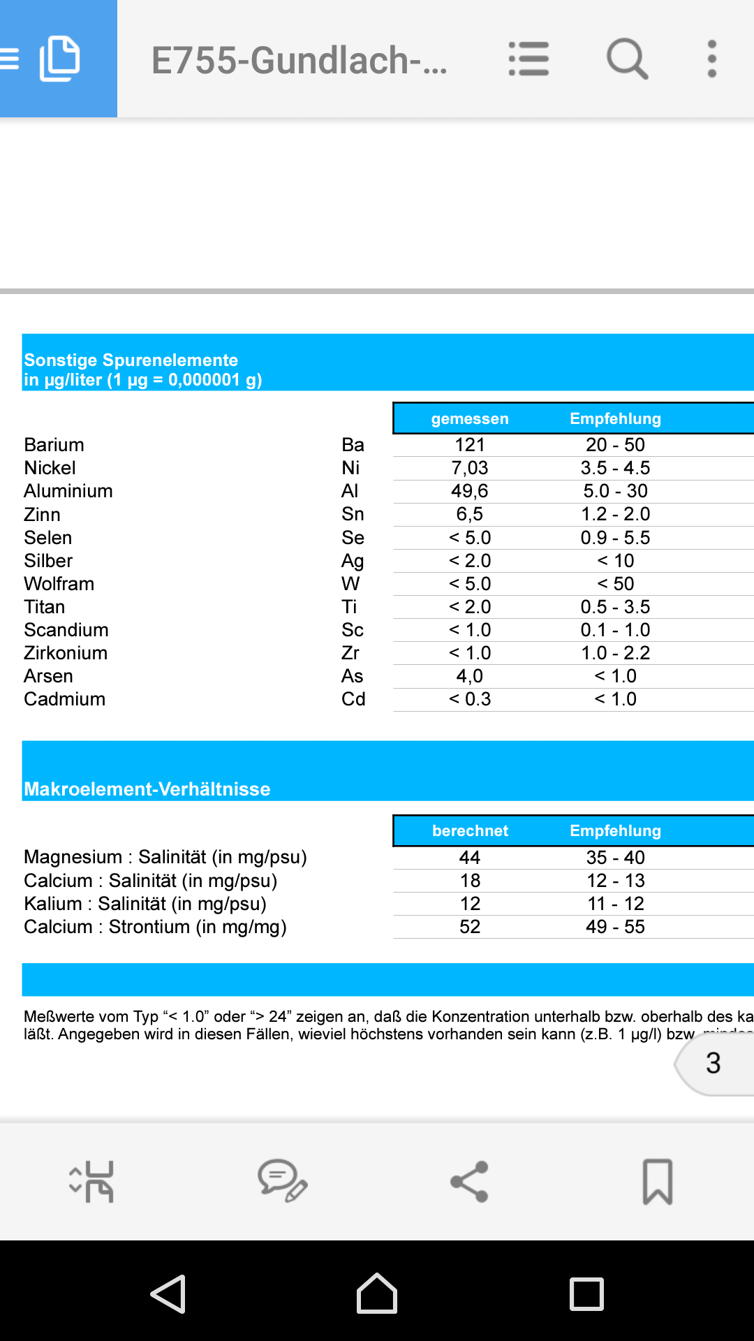 Zink ist erheblich zu hoch. KH zu niedrig. Das mit dem KH-Wert war mir auch schon bewusst. Silikat ist auch erhöht. Bor ist etwas zu niedrig. Am meisten Kopfschmerzen macht mir das CA-Messergebnis. 631 ist schon heftig. Nach der Abnahme der Analyse habe ich einen WW durchgeführt. Nun habe ich meinen Test mit der Referenz von Peter Gilbers getestet. Ergebnis 410. Somit ist mein Test nicht im Eimer und funktioniert. Anschließend habe ich einen Calciumwert von 440 gemessen. Bei beiden Tests war eindeutig der Umschlag zu blau. Also müsste mein Messergebnisse korrekt sein? Oder bin ich völlig auf dem Holzweg? Kann es sein das ich durch einen WW (mit Fauna Marin Professionell) den CA-Wert dermaßen gedrückt habe? Nach dem WW habe ich auch weiterhin Ca dosiert (89ml). Bin da ein wenig ratlos?!