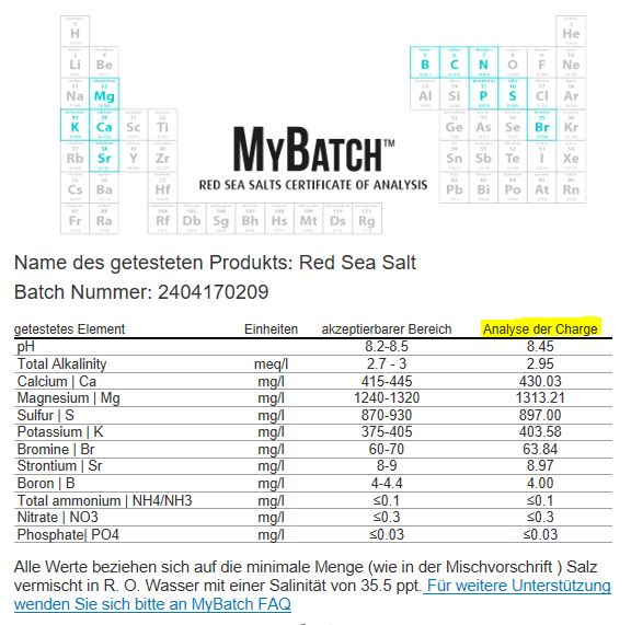 Das angehängte Bild zeigt das Analyseergebnis meines letzten Red Sea Salzes. Ich verwende das Red Sea Salt.