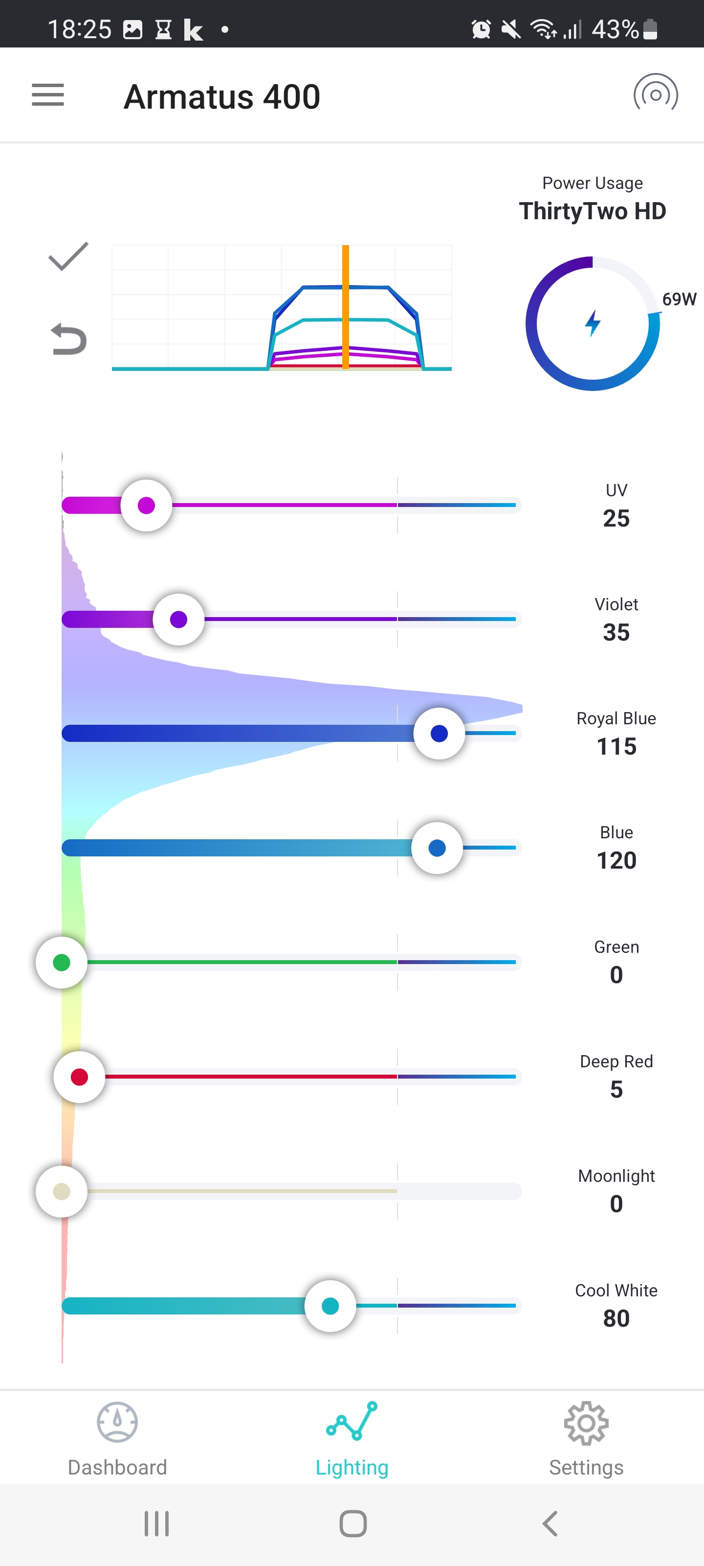 Ich würde mit den Röhren das UV weglassen, violett auf max. 20, royalblue max 100, weiss auch bis 100 und grün und rot jeweils 15.