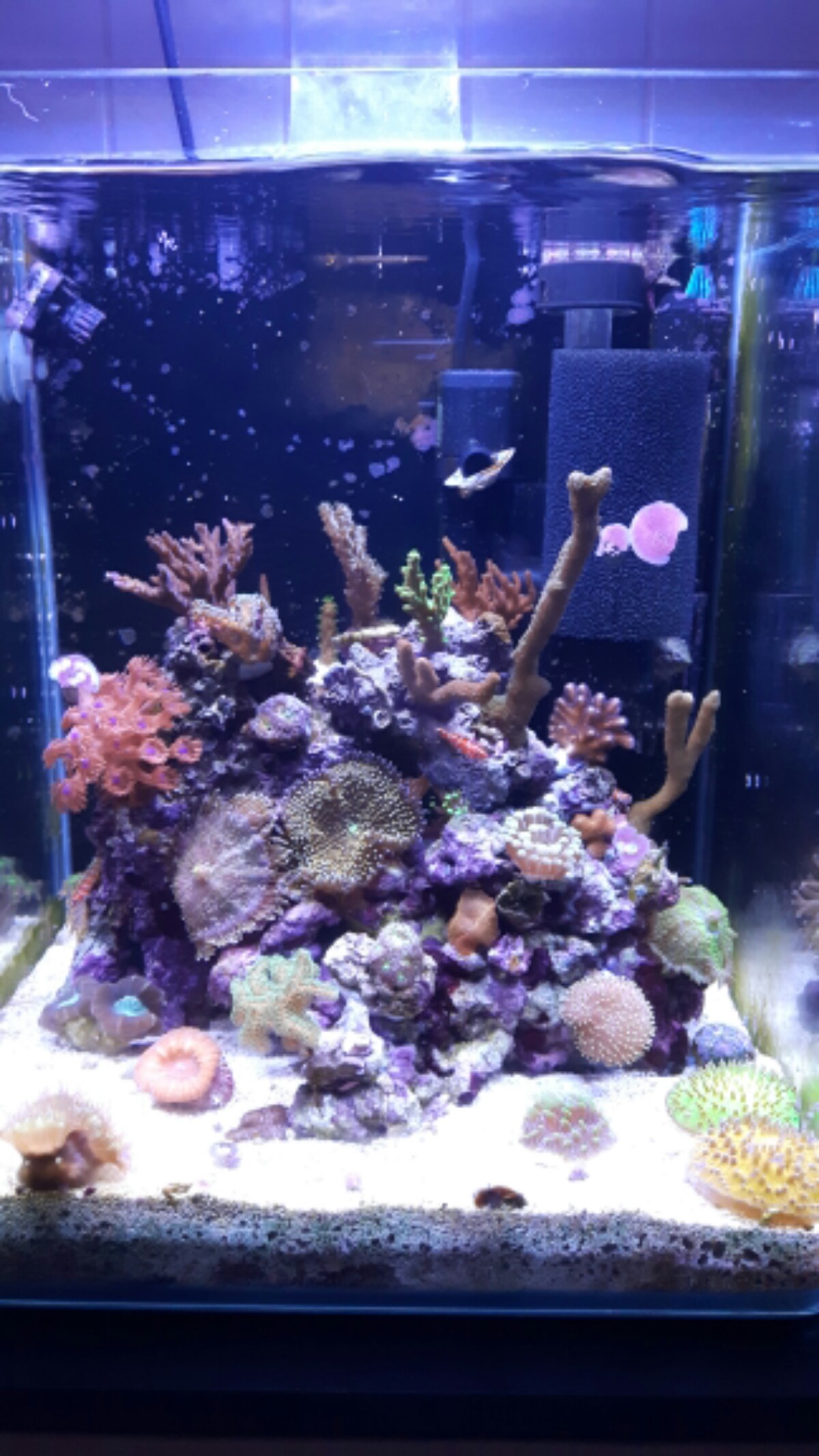 So, was war noch???? vor 2 Wochen habe ich einen einzelnen RealReef Rock eingebracht. Ein paar Korallen umgestellt im großen becken und festgeklebt mit 2 Komponentenkleber. Strömung läuft gut. Abschäumer schäumt etwas feuchter ab und 2x /Woche geleehrt.
