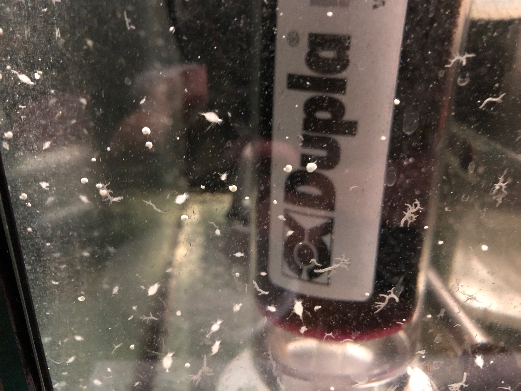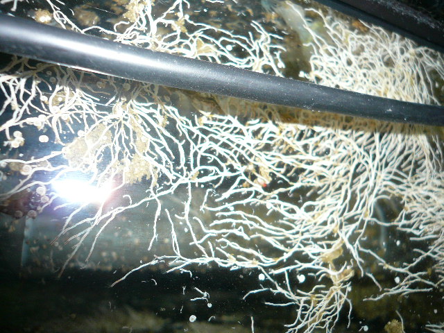 gefühlt von einem Tag auf den anderen (und in Wahrheit sind es höchstens 3 Tage) waren von blanken Scheiben im Technikbecken diese schlagartig mit 3 verschiedenen Dingen besiedelt. Und zwar ziemlich dicht! Auch im Ablaufschacht finde ich diese Wesen/Ablagerungen.