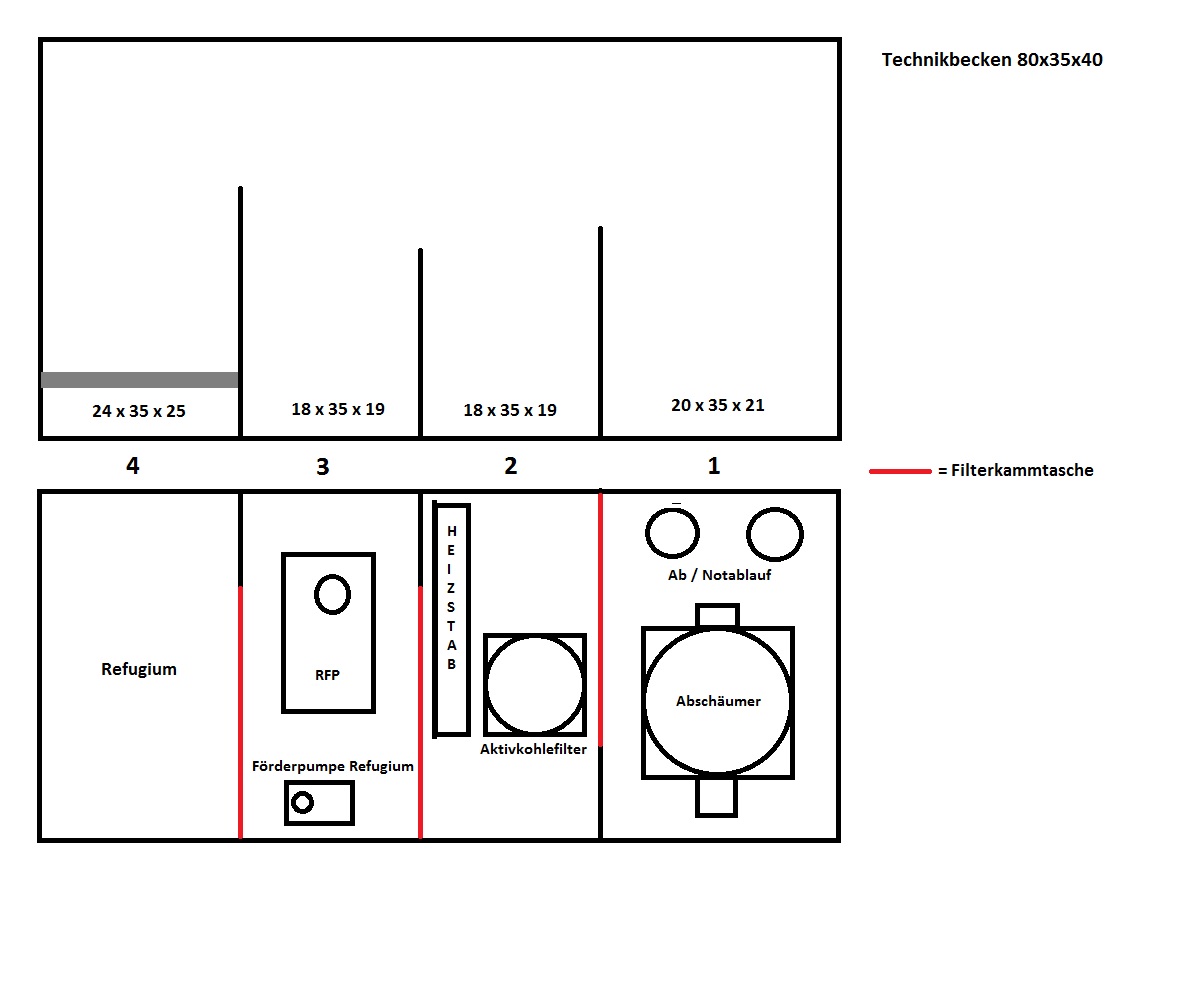 Kannst du dein Technikbecken etwas breiter machen? Bei einem Technikbecken mit Refugium würde ich das Refugium an die Seite packen (ich weiß, das macht kaum einer). Ich denke, das Refugium wäre dann einfacher und konstanter zu hinsichtlich der Strömung zu betreiben. Bei einer quadratischen Form sucht sich das Wasser seinen Weg und die Hälfte des Refugiums hat kaum eine Wasserbewegung.