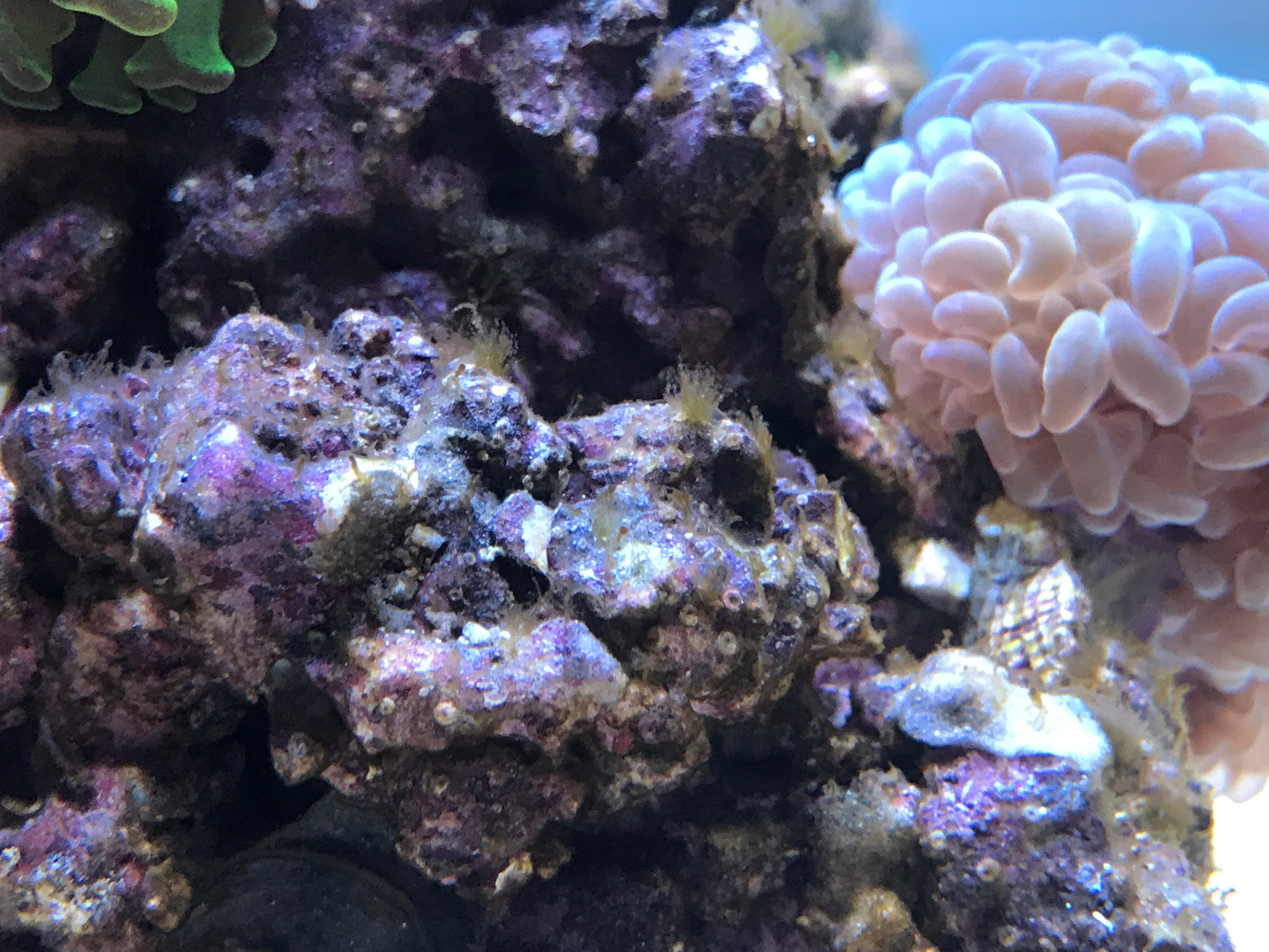 Meine Kieselalgen sind verschwunden und nun habe ich diese Algen bekommen. Sie wachsen am Kies und am Riff, es bilden sich teilweise auch Blasen. Was könnte das sein und gibt es hier Handlungsbedarf?