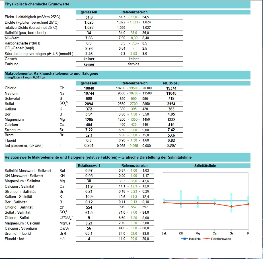 Das Wasser hast Du vermutlich so übernommen wie es war? Das müsstest Du eigentlich idealerweise komplett austauschen, da sind so viele Parameter die nicht richtig eingestellt sind, v.a. hast Du nicht nur krass zu hohe Nährstoffe, sondern auch zu viel Spurenmetalle, Iod ist viel zu hoch, dann ist in der Hauptzusammensetzung eine Ionenverschiebung hin zu Na und Cl (was von einer alten Balling Anwendung kommt), weshalb Stoffe wie Schwefe/Sulfat, Bor oder Kalium und Fluorid zu niedrig sind. Das sind so die Hauptprobleme. Aber das Wasser musst Du gegen frisches Austauschen, in dem Wasser wird sich keine Koralle erholen und das Wasser wird so auch von alleine nicht besser. Wie gesagt, gebrauchte Becken sind dahingehend immer sehr schwierig bis unmöglich und hier muss man dann auch leider viel investieren, sowohl Zeit als auch Kosten für Wasser und Salz.