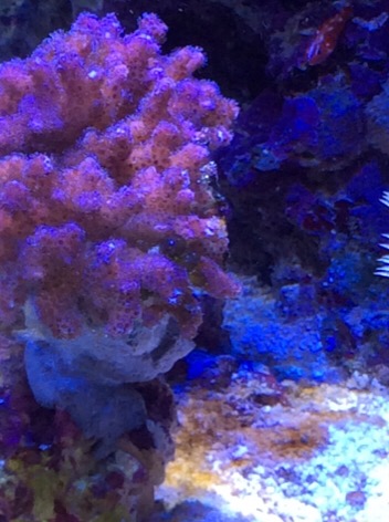 wenn die Koralle fest gewachsen ist kannst du versuchen das mit einer Pipette weg zu pusten. Sieht nach einer Gewebeschädigung aus an der sich jetzt Algen ansiedeln.