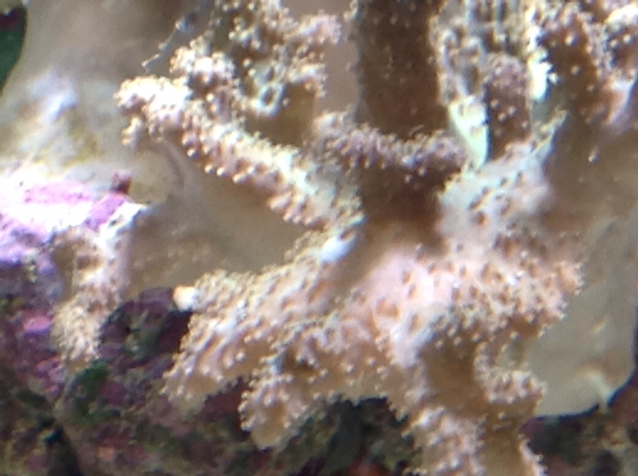auf einem so unscharfen Bild kann man leider nix erkennen. Was aber auf Lederkorallen regelmäßig sitzt, sind sessile Rippenquallen. Das sind kommensalische Bewohner die durch ihre beiden Leimrouten auffallen. Schau mal hier.