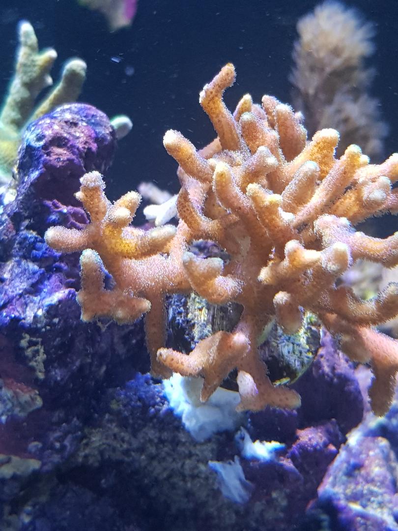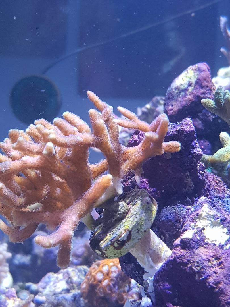 Die seriatopora ist bisschen eingebraunt und hat von der Basis her ein wenig Gewebe verloren. Hatte sie vor dem Lichtwechsel weiter nach unten gestellt - jetzt wieder nach oben und der Gewebeverlust hat meiner Meinung nach aufgehört.