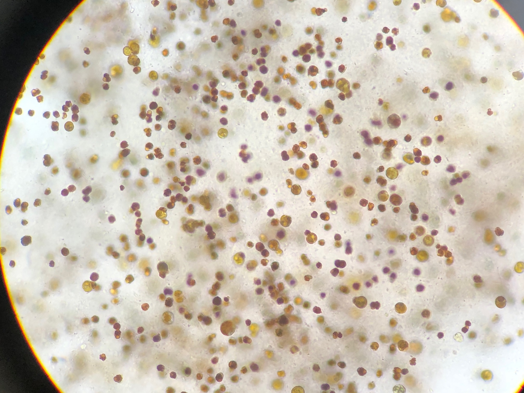 Jedoch bekomme ich von Beginn an kein Nitrat und Phosphat ins Becken. Analysen ergeben stets nicht nachweisbar. Ich füttere täglich Frostfutter und gebe seid heute auch Sangokai NutriP und NutriNP hinzu. Zwei Euphyllia machen so langsam wieder etwas auf. Kann der Närstoffmangel an einer zu starken Beleuchtung liegen? Dieses Thema ist für mich echt ein sehr schweres Thema. Ich nutze für das Becken eine Mitras lx7206 mit den Einstellungen von Jörg und auf dem Modus high efficiency bei 100%. Hatte vorher auf High Output 80% (Empfehlung von GHL), jedoch fingen dann enorm die Algen an zu sprießen. Es zeigen sich immer einige Korallen (Euphyllia, Ricordea und andere) die regelmäßig so braunes Zeug aus ihrer Mundöffnung entlassen. Habe dieses Zeug mikroskopert, aber weiss nicht ob es Zooxanthellen sind (Bild ist unten). Sie bewegen sich nicht. Der Boden ist mittlerweile wieder sehr braun, jedoch vermehrt anstellen unterm Riff, wo weniger Licht hinkommt.