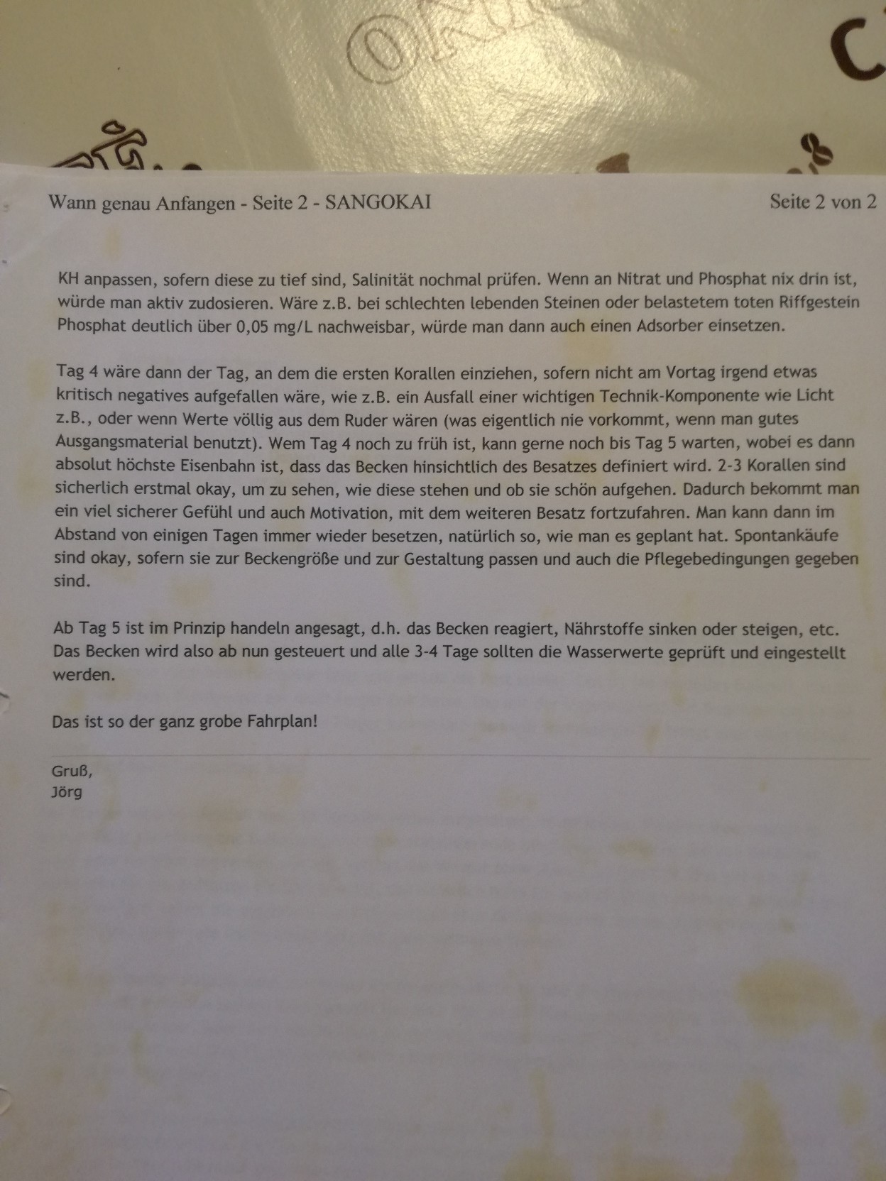 Ich glaube am 3. Tag beginnst Du dann mit der Dosierung und legst auch schon los mit zügigem Besatz an Korallen.