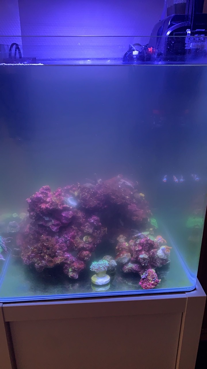 Habe dann einen wasserwechsel von 7,5l gemacht und heute ist die Trübung immer noch extrem. Das Sterben der Schnecke wird definitiv nochmal einen ordentlichen Schlag oben rauf gegeben haben! Zusätzlich scheint einer der Clowns dadurch Pünktchen abbekommen zu haben… das alles nach dem die Bryopsis so übertrieben gut von den Schnecken kalt gemacht wurden! Das einzige ist, dass die Schnecken regelmässig meine ganzen Ableger um/runter schmeissen.. das nervt. Hier muss ich mir nochmal überlegen, die doch zu verkleben.