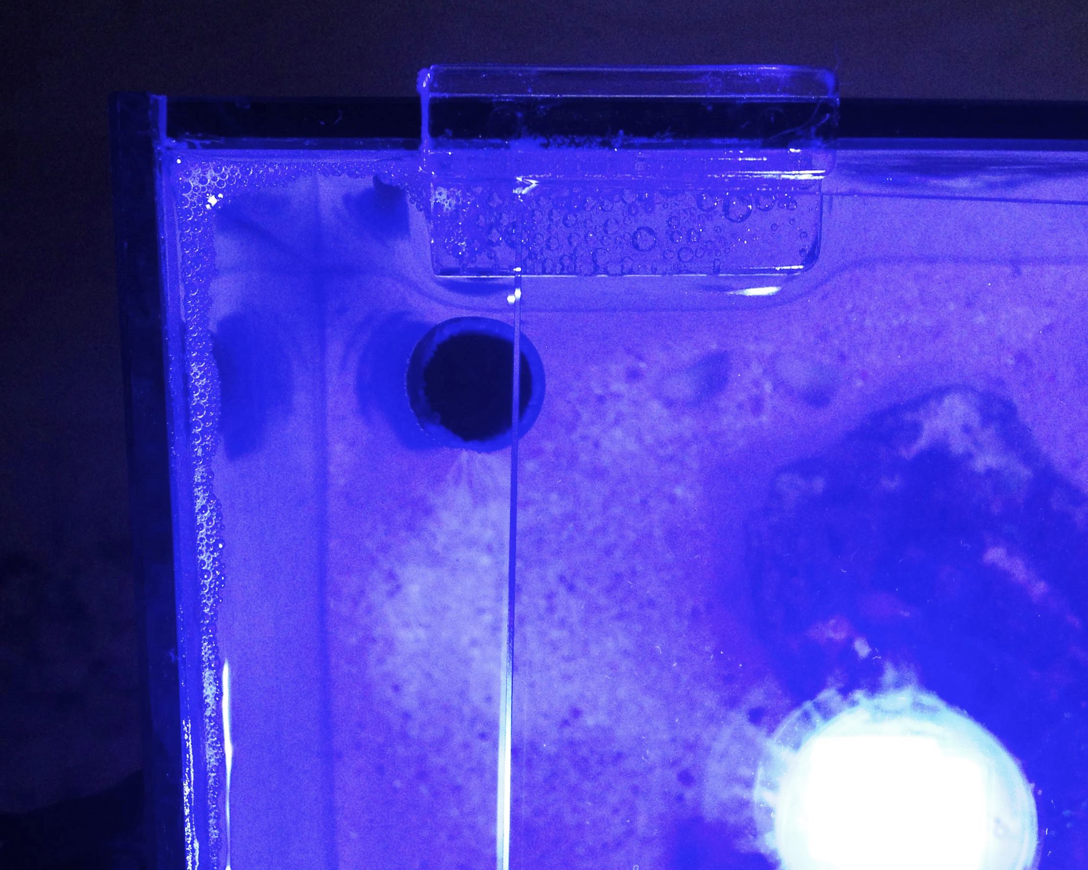 Leider fand sich kein Glaser der das Becken bohren wollte (zu dünnes Glas, zu nah am Rand, bla bla...) also habe ich mir kurzerhand eine 22mm Diamantbohrkrone (ca. 8 EUR) im Baumarkt besorgt und die Löcher selbst gebohrt. Beim ersten Loch habe ich noch ohne Bohrschablone in der Dusche gebohrt, war eine ziemliche Sauerei + derbe zerkratztes Glas (war zum Glück der Beckenboden). Beim zweiten Loch habe ich dann noch fix ne Bohrschablone gebastelt (alte Plexiglasscheibe fix mit der Bohrkrone gebohrt) und dann aufgelegt und gebohrt, diesmal gab es ein super sauberes Loch an der Rückwand.