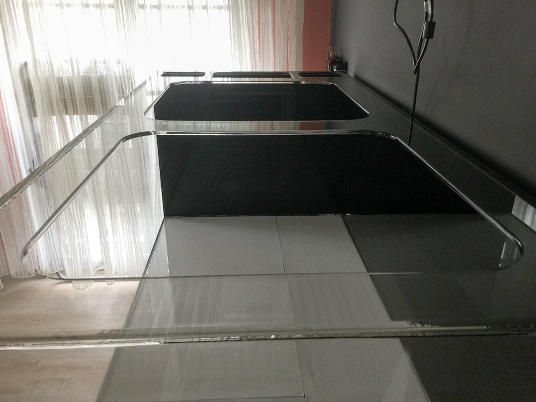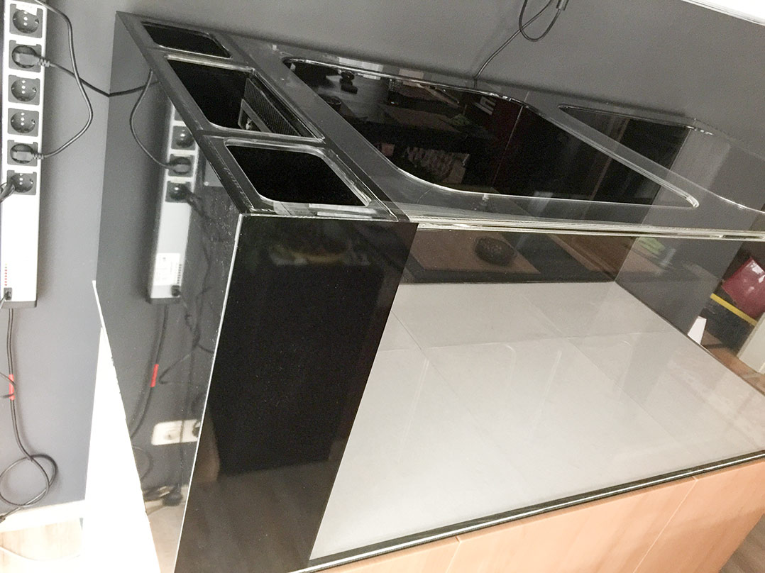 Ich wollte einfach keinen Ecküberlauf mehr und man sieht von außen auch keine Pumpen mehr. Die 20cm werden dann auch noch ums Eck foliiert. Ergo werde ich 150x80x60 zur Verfügung haben. Nach Abzug von Wasserhöhe und Dicke der Scheiben werden es wohl um die 620l werden.