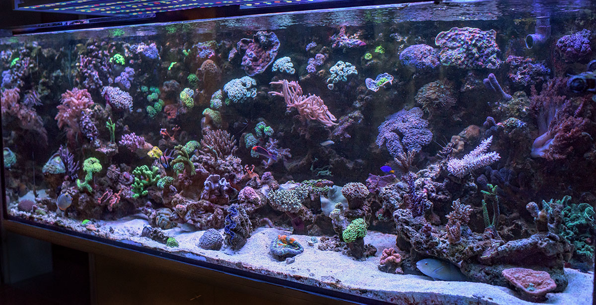 Gestartet habe ich im Januar 2015, dass Becken hat die Maße 200x70x70, im Nebenraum ist mein Technikbecken inklusive Refugium, mit den Maßen 160x50x50.