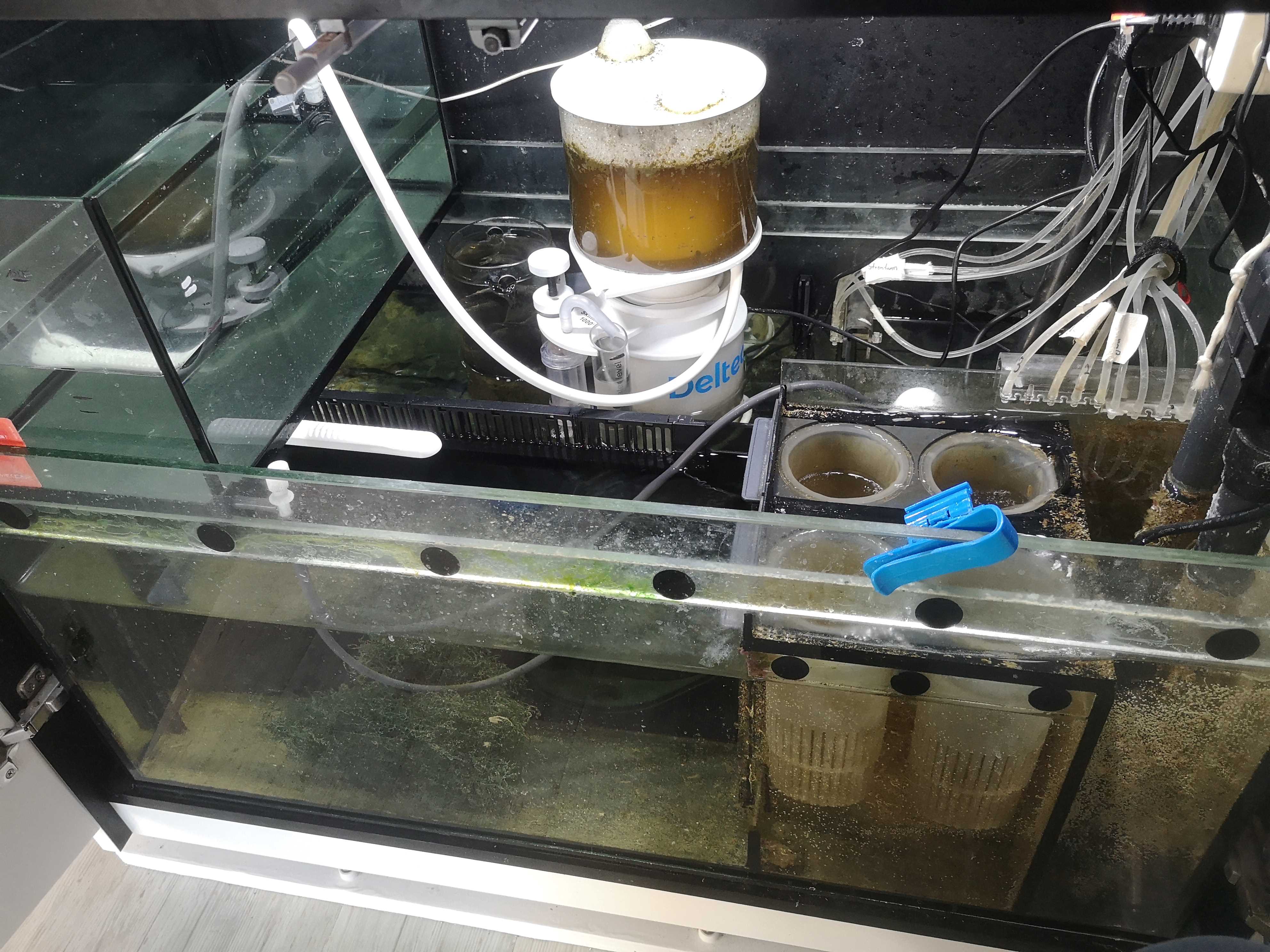 Ich würde Dir empfehlen mal Nitrit zu messen um zu prüfen, ob das ggf. die Nitratmessung beeinflusst. Allerdings spricht der deutlich erhöhte Phosphatgehalt auch eher dafür, dass Du entweder eine Depotbildung im Becken hast, aus denen sich Nitrat und Phosphat zurück lösen, oder Du hast eine zu hohe Futterbelastung, respektive Rückstände im Ausgangswasser. Ich würde, wenn der Bodengrund älter ist als ein Jahr, den mal komplett absaugen und austauschen, meistens sind das eben Depots die sich dort anreichern und die sich irgendwann ins Wasser zurück lösen. Wobei Du auf den Foto nicht so viel Sand im Becken hast. Ggf. den aber mal absaugen. Und die Kontrolle und Reinigung des Technikbeckens ist wichtig und ggf. mal eine Generalreinigung von Abschäumer und Rückförderpumpe, damit die auch 100% leistungsfähig sind. Möglicherweise hast Du z.B. nicht mehr das effektive Durchflussvolumen durch das Technikbecken, das Du für eine gute Auslastung des Abschäumers brauchst, also hier v.a. auch mal die Rückförderpumpe checken.