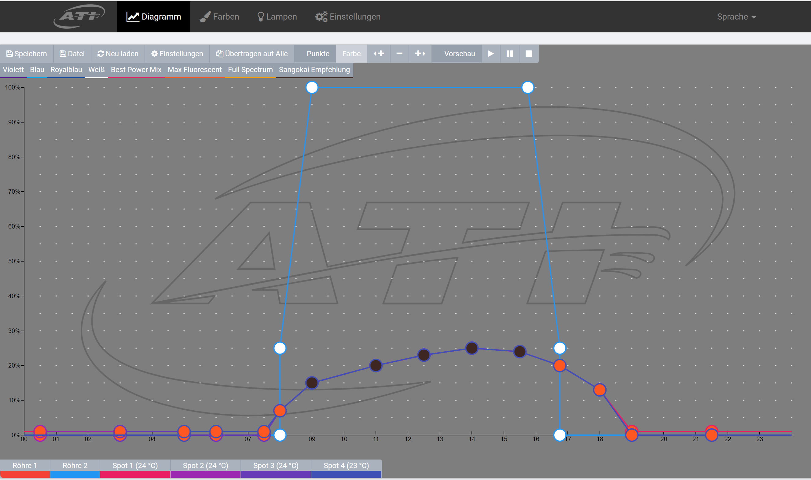 Hier sind mal die Lampeneinstellungen. Die Lampe ist ne ATI Hybrid mit 4x80 T5 und 4x75 LED Watt.