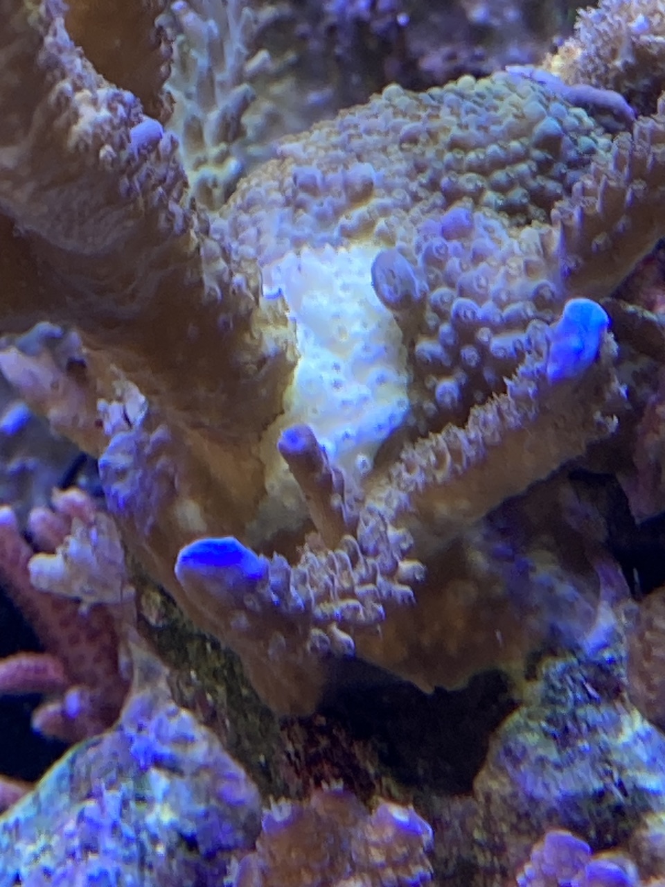 Übrigens diese SPS scheint sich zu regenerieren..bei dem letzen Bild von ihr war das Gewebe weiß …
