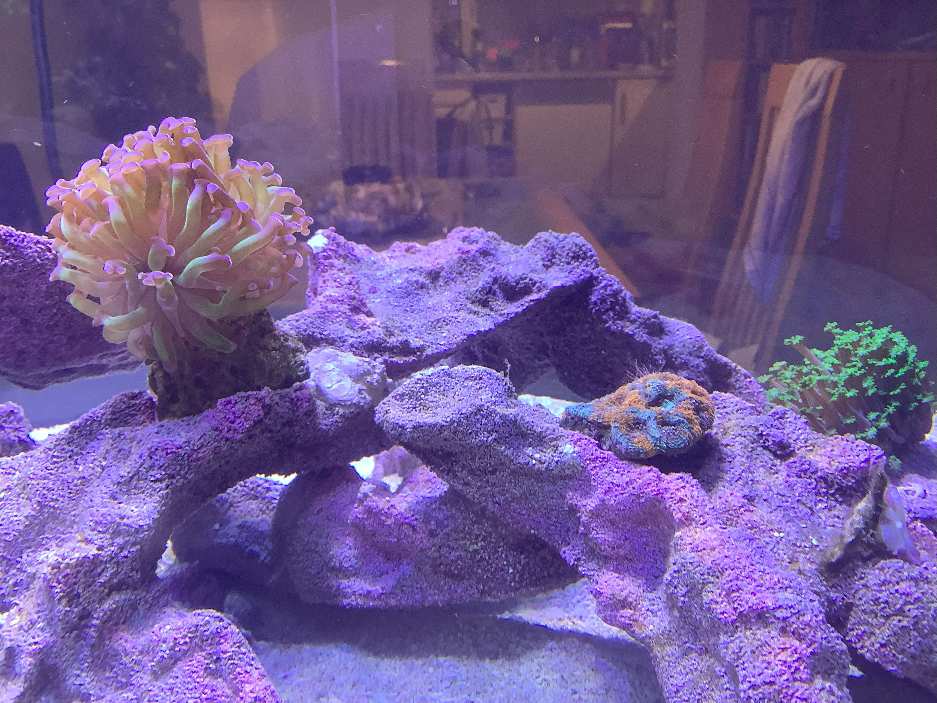 Am Wochenend hab ich weitere 4 Korallen nachgesetzt, sowie eine Cleaning Crew mit Schnecken und einen Seeigel und ein Clownfisch Pärchen.