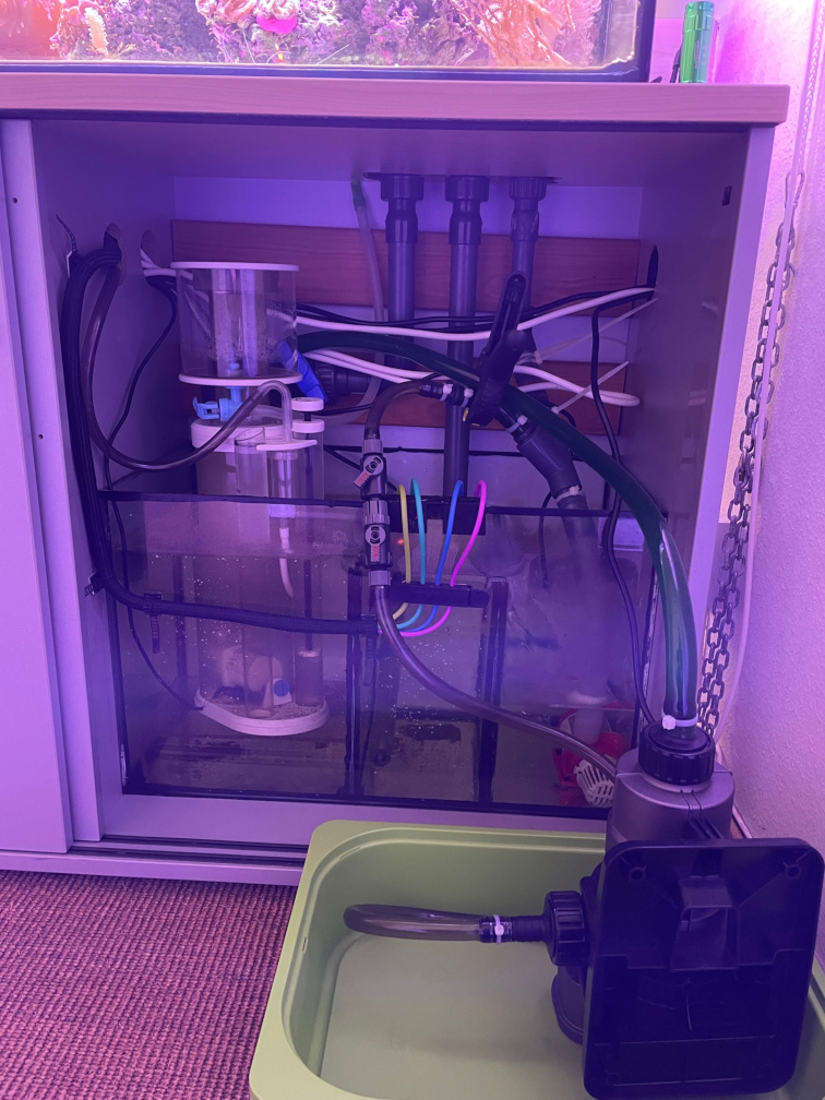 Nach vielen Höhen und Tiefen geht es seit ~4 Wochen bergauf. Während des Sommerurlaubs gab es heftige Schwankungen bei den Wasserwerten, verbunden mit kräftigem Wachstum von Fadenalgen und Aufwuchs auf den Scheiben. Großzügige Wasserwechsel (40 L auf 180 L gesamt) und der konsequente Einsatz einer UV-C-Lampe haben geholfen. Am steigenden KH-Verbrauch ist das Wachstum der Korallen nun deutlich zu erkennen. Bald müssten auch die Zoanthus (links vorne) und die Weichkorallen (mitte vorne) loslegen, die bisher eher vor sich hin gekümmert haben. Die Fadenalgen dünne ich derzeit mit der Hand aus, der Algenblenny bekommt dann die Reste.