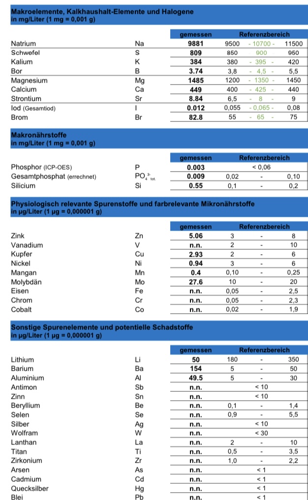Womit überprüfst du die Salinität manuell? Wenn man den Natrium Wert als Anhaltspunkt mit nem Richtwert von 11000 mg/l bei 35 psu nimmt, bist du ungefähr bei einer Salinität von ca 31,2. Deswegen sind einige Elemente wie Bor und Schwefel am unteren Rand des angegebenen Normbereichs, Ca und Mg durch das Dosieren der Balling Salze aber eher am oberen Rand. Iod ist allerdings sehr gering, das liegt nicht an der geringen Salinität. Das solltest du im Auge behalten auch nach der Anpassung der Salinität. Dosierst du Phosphat?