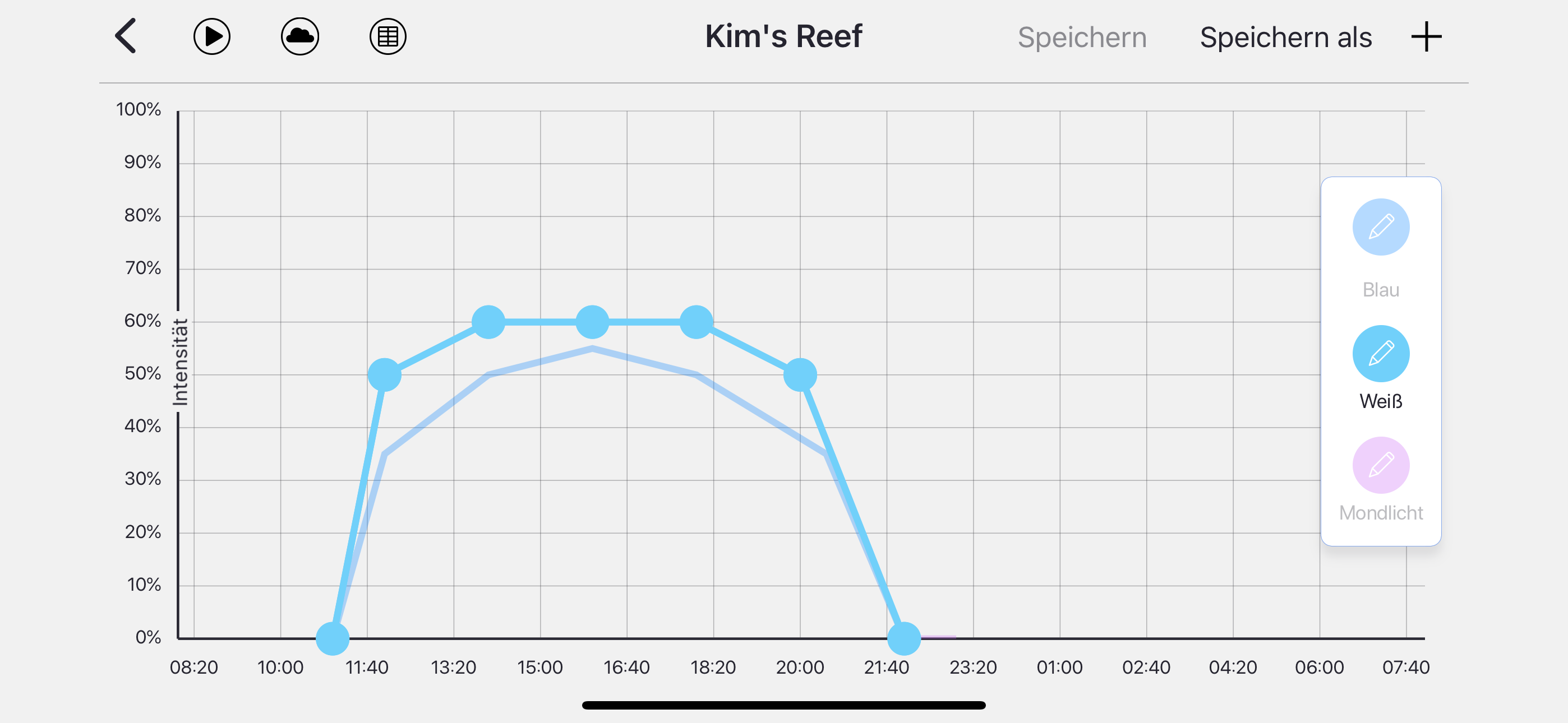 Den weißen Kanal auf 100% auf jeden Fall damit man überhaupt so etwas bekommt wie Farbwiedergabe. Und dann hat die im blauen Kanal auch echtes UV-A verbaut, was man alles nicht rausnehmen kann. Da steht zwar reef safe drauf, aber das ist schon eine mutige Aussage. Von daher würde ich den blauen Kanal auch gar nicht mal so voll ausreizen und eher dann die wenigen weißen LEDs auf 100% fahren. Aber Du kannst die optisch auch so einstellen, wie es DIr gefällt.