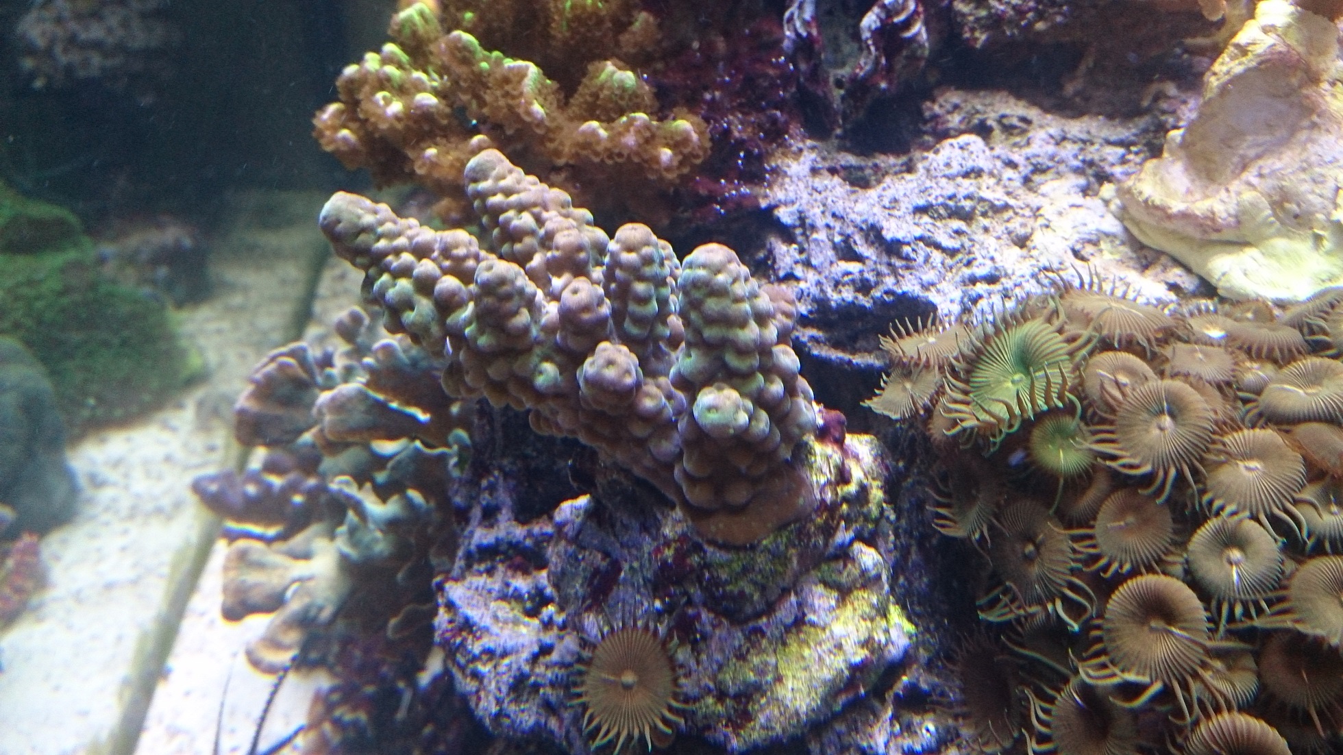 Man sieht wie die meisten Korallen gut stehen, manche Acropora aber Probleme mit ihrer Farbigkeit haben. Ich hoffe das wird mit sinkendem Phosphatwert besser.