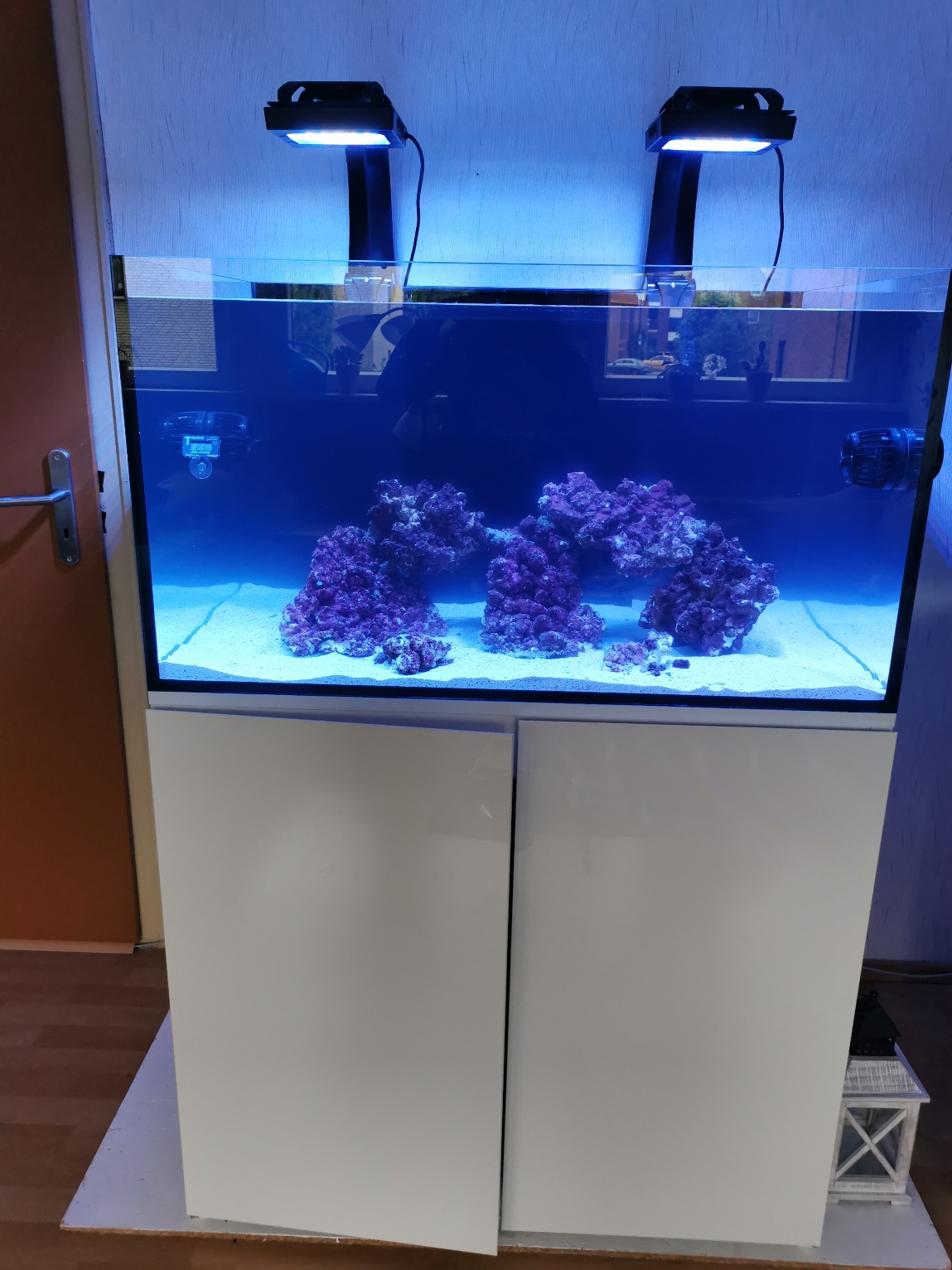 Bis jetzt habe ich einen leichten Kieselalgenbelag vorne links. Ich schätze mal, dass dort nicht genügend Strömung ankommt. Die Beleuchtung, die Strömungspumpen und die Rückförderpumpe laufen über die Mobius App, was nach anfänglichen Schwierigkeiten sehr gut funktioniert.