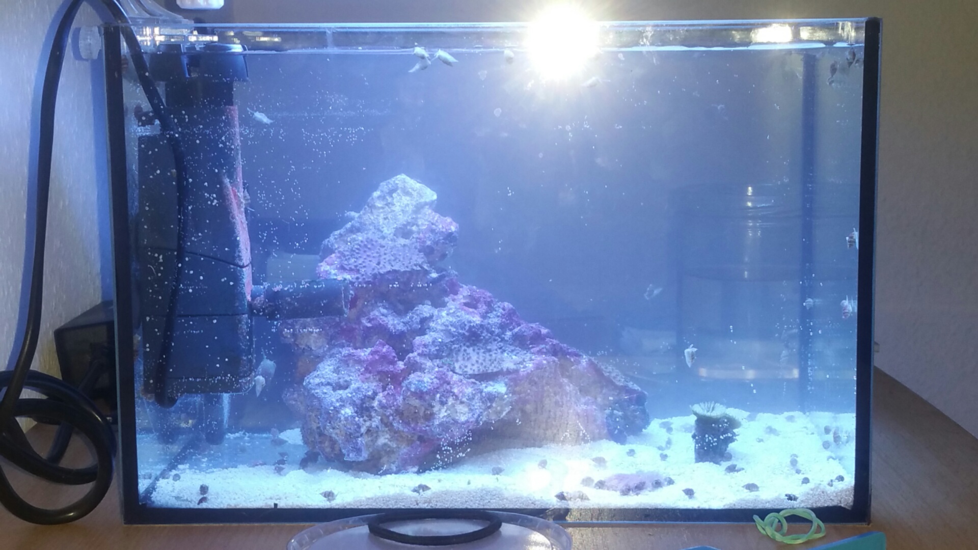 Lampe, heizstab, skim 350, ein kleiner Brocken caribsea life rock der komplett mit briareum bewachsen werden darf, eine arg in mitleidenschaft gezogene euphyllia, eine Hand voll Sand und sage und schreibe 164 nassarius Schnecken schmücken nun mein neues Wohnzimmer :mrgreen: