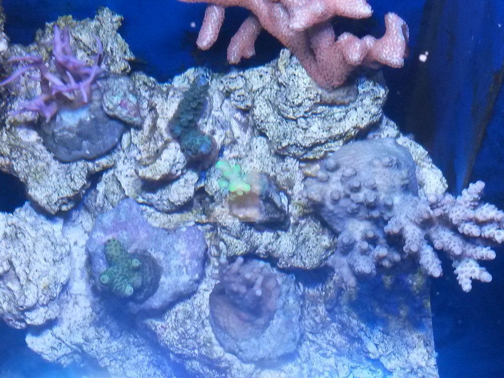Das chem-ioF dosiere ich täglich mit 1 Tropfen / 100 Liter. Außer meiner hyacinthus (wie man auf dem Foto sieht) bekommen alle Acros wieder so langsam Farbe. Fällt auf dem Foto wahrscheinlich nicht so auf, aber ich kann bei der Acro (vielleicht kann sie jemand bestimmen) die neben der millepora steht erkennen das Sie so langsam wieder lila wird und die Polypen grün werden.